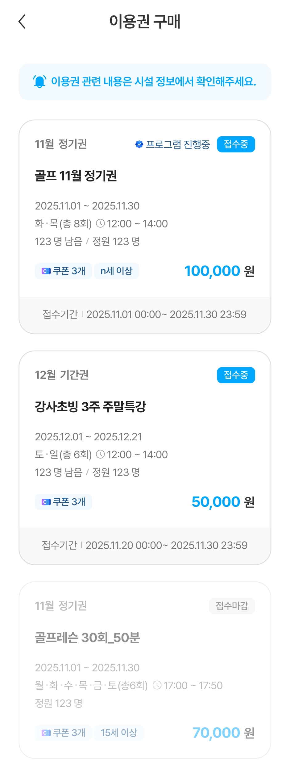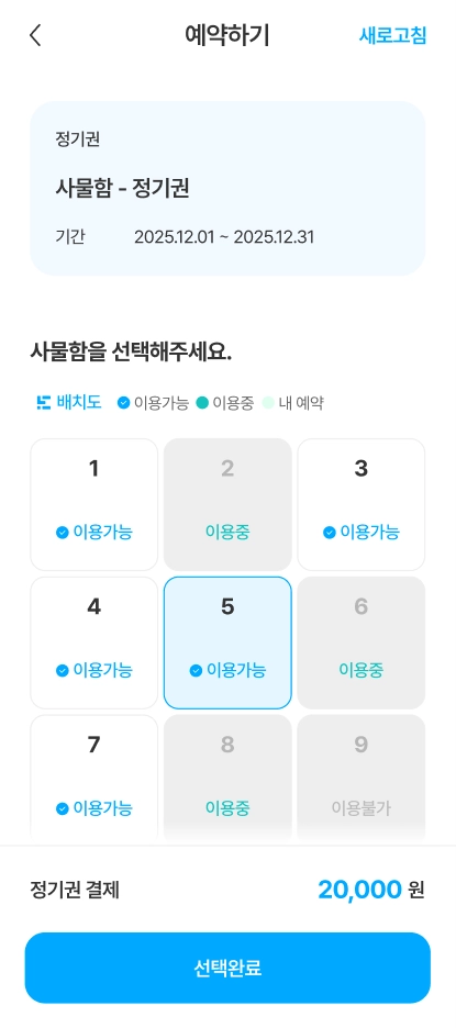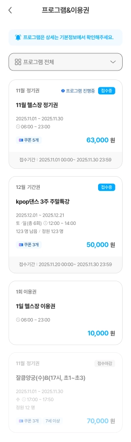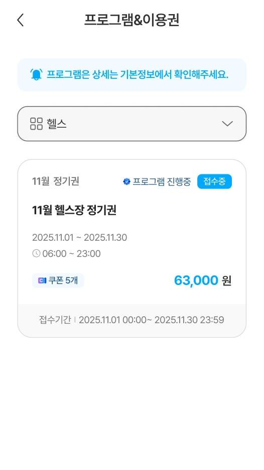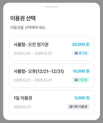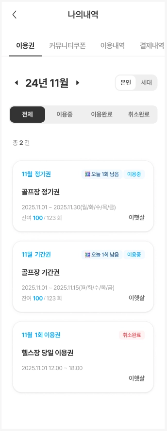 이용권은 월 단위로 표시되며, 이용권의 이용가능 상태 ‘이용중’, ‘이용완료’, ‘취소완료’를 기준으로 분류하여 확인할 수 있습니다.