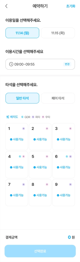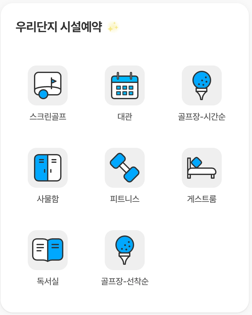 화면에 표시된 아이콘은 커뮤니티 시설을 분류한 항목이며, 원하는 아이콘을 선택하면 해당 시설에서 예약 가능한 시설들을 확인할 수 있습니다.