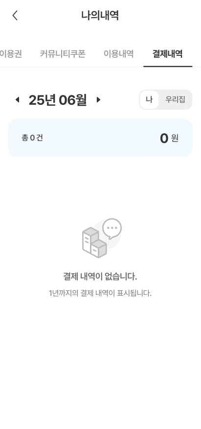[나]를 선택하면 본인의 결제내역만 확인이 가능하며, [우리집]을 선택하면 세대 구성원 모두의 결제내역을 확인할 수 있습니다.