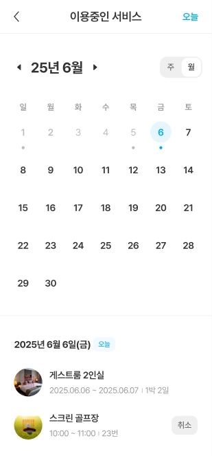 달력의 예약이 있는 날짜에는 점이 표시되며, 이를 통해 전체적인 이용 현황을 확인할 수 있습니다.