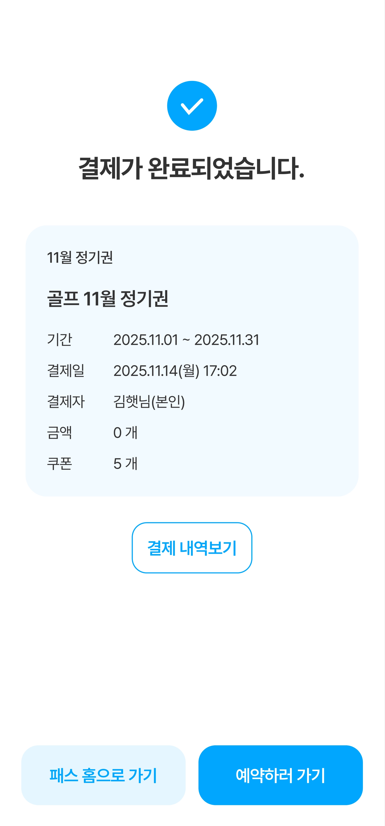 패스 홈에서 [이용권] 버튼을 클릭하면 ‘나의내역’ 페이지에서 이용권 정보를 확인할 수 있습니다.