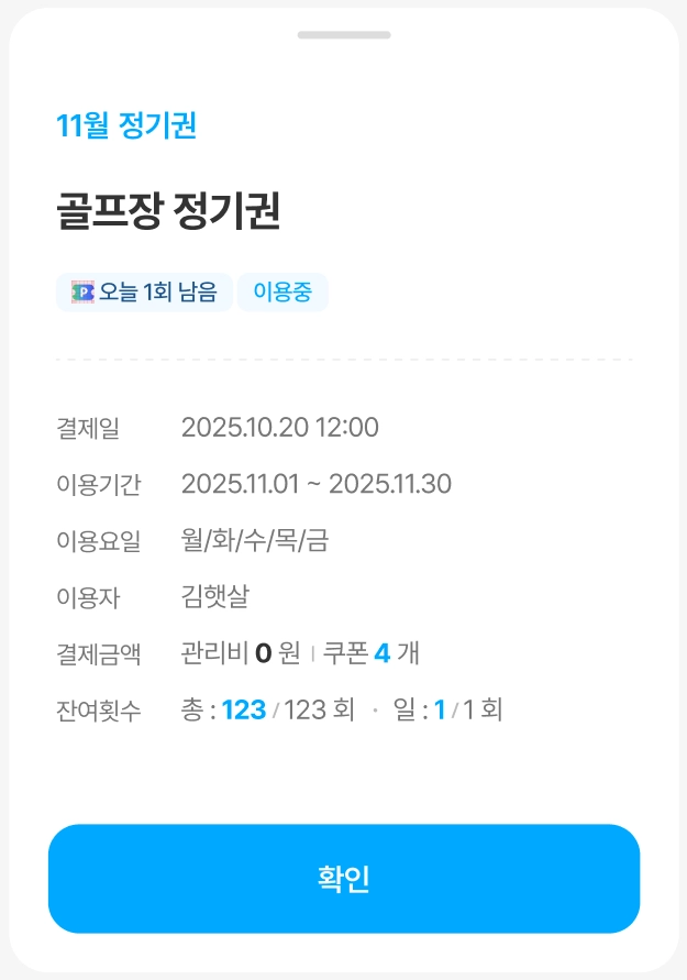 목록에 표시되는 이용권 탭시, 결제 정보를 포함한 이용권 상세 내용을 확인할 수 있습니다.