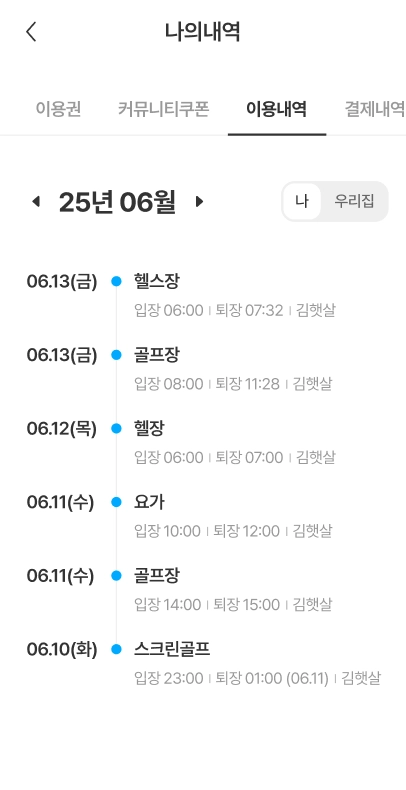 [나]를 선택하면 본인이 이용한 내역만 확인이 가능하며, [우리집]을 선택하면 세대 구성원 모두의 이용내역을 확인할 수 있습니다.