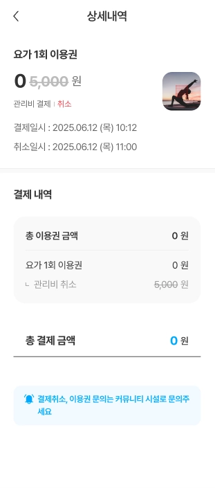 세대(우리집) 구성원이 사용한 이번달 전체 커뮤니티 시설 이용금액이 표시됩니다.