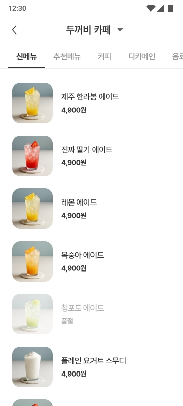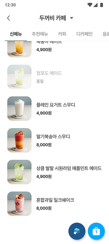 카페에서 제공하는 상품 카테고리를 선택하면, 해당 카테고리의 상품 목록이 표시됩니다.