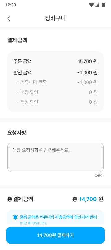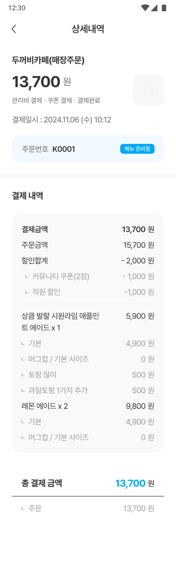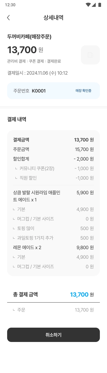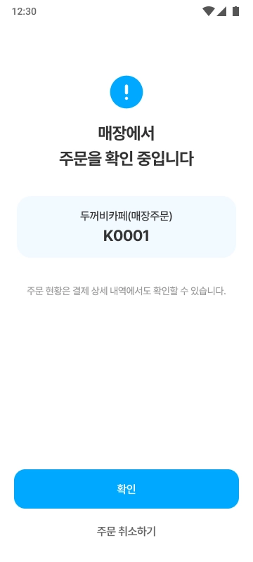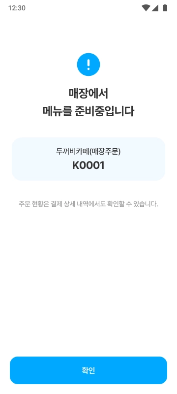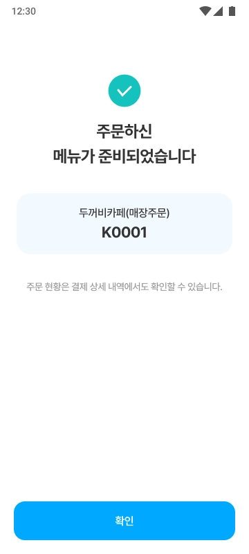 [결제하기] 버튼을 누르면 결제가 진행되고, 매장으로 주문 알림이 전송됩니다. 매장에서 주문을 수락하면 주문이 최종적으로 완료됩니다.