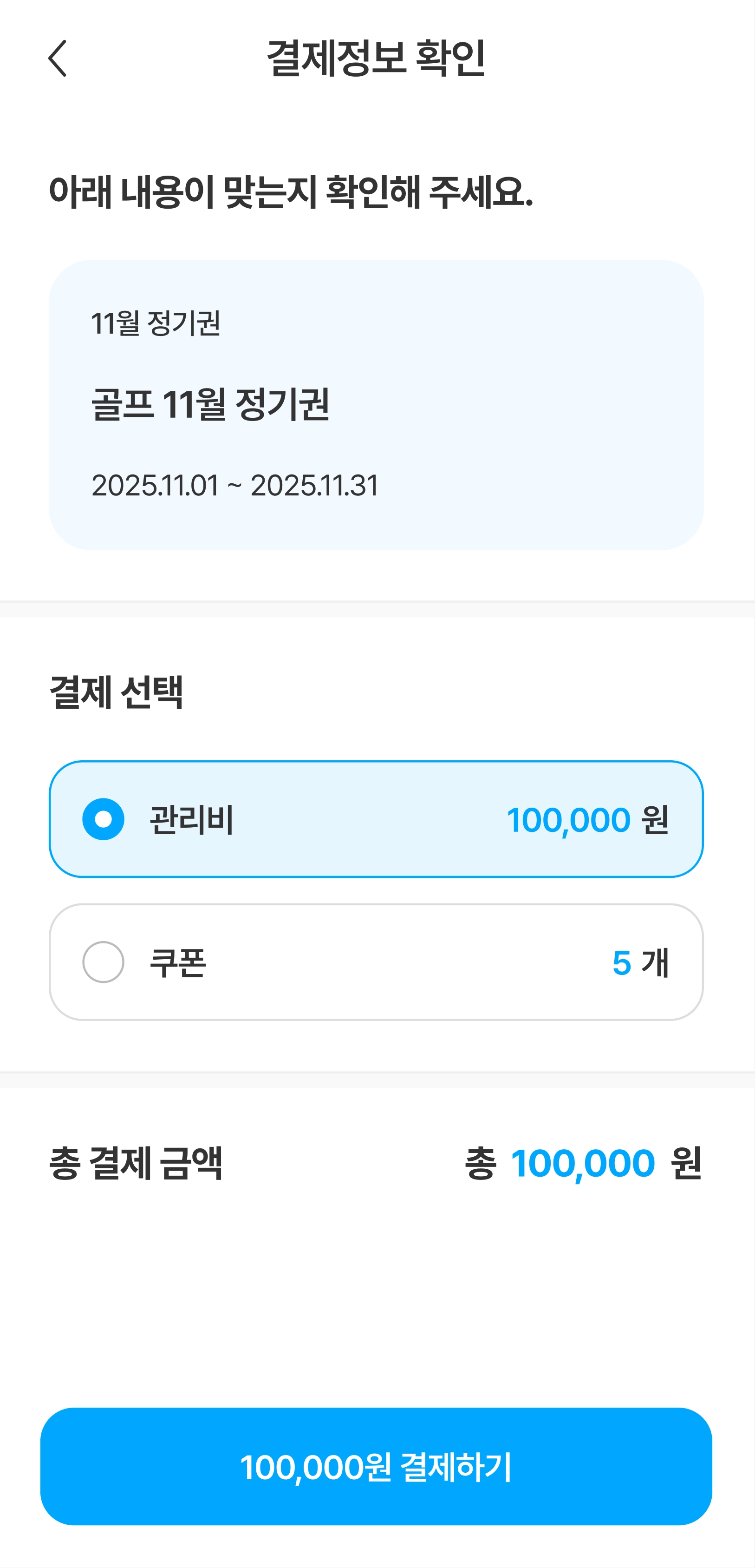 선택한 ‘월’을 기준으로 당일까지의 월별 총 결제 건수와 결제 금액이 노출됩니다.