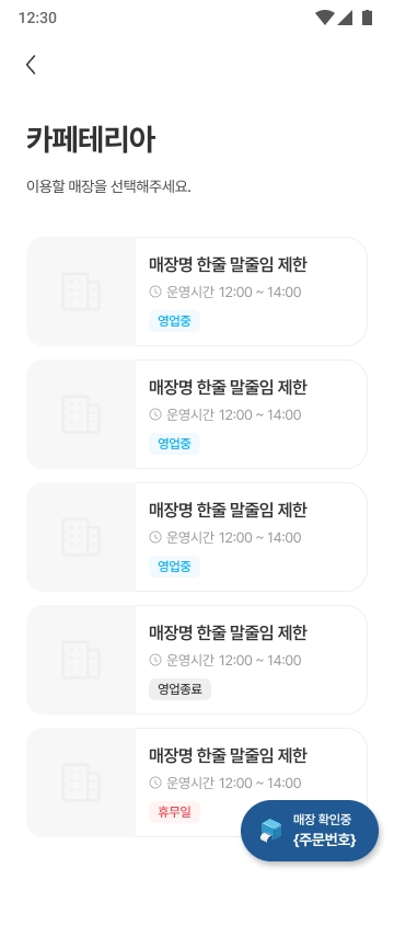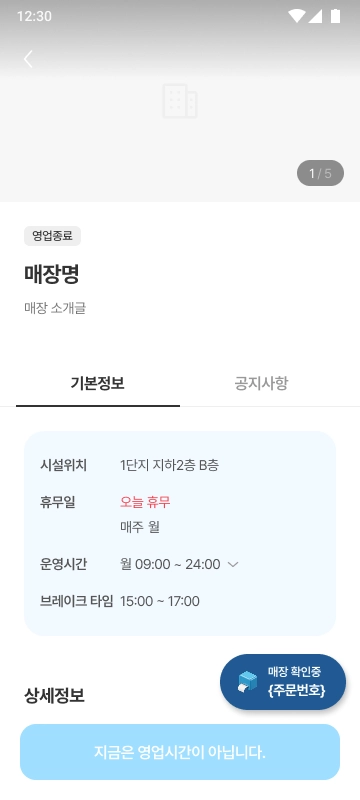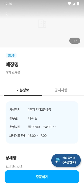 매장의 주문 수락, 준비 완료 등 주문 상태에 따라 화면이 단계적으로 변경됩니다.