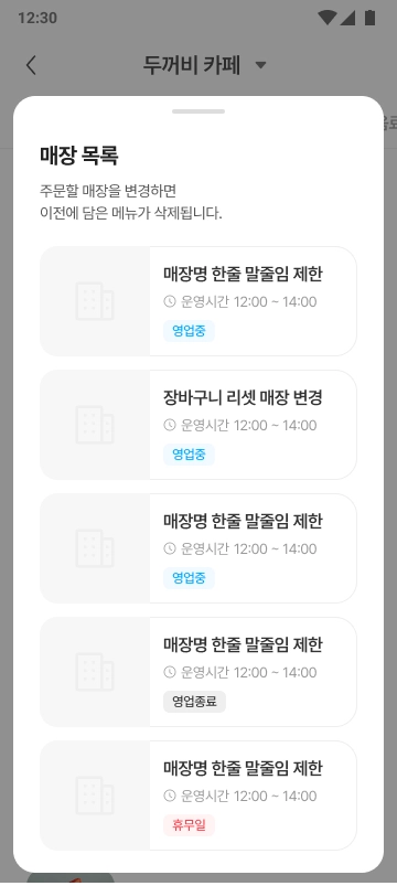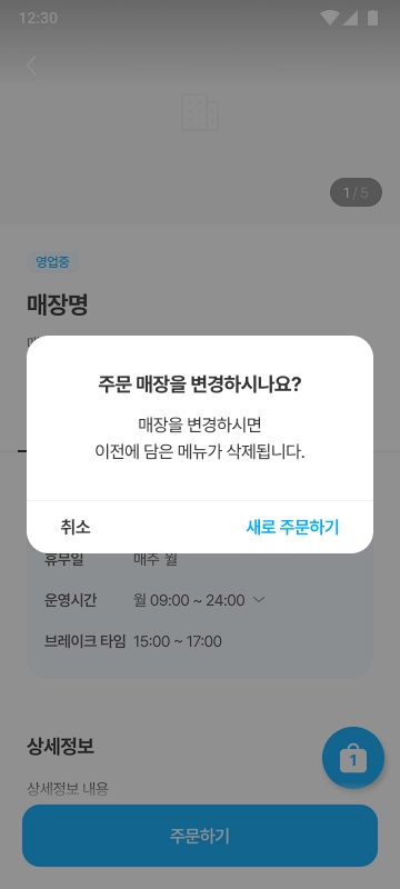 매장 정보 영역의 [변경] 버튼을 눌러 주문 매장을 변경할 수 있습니다.