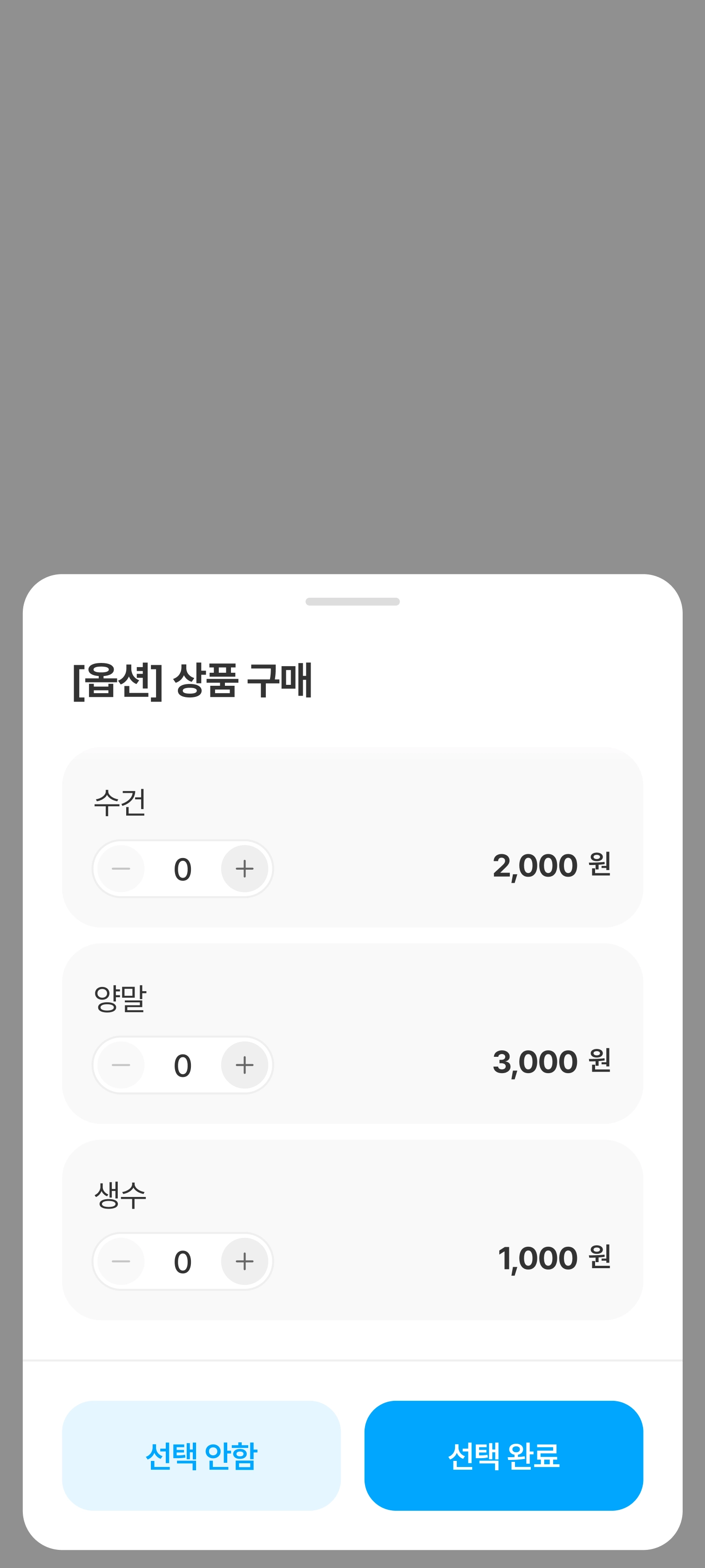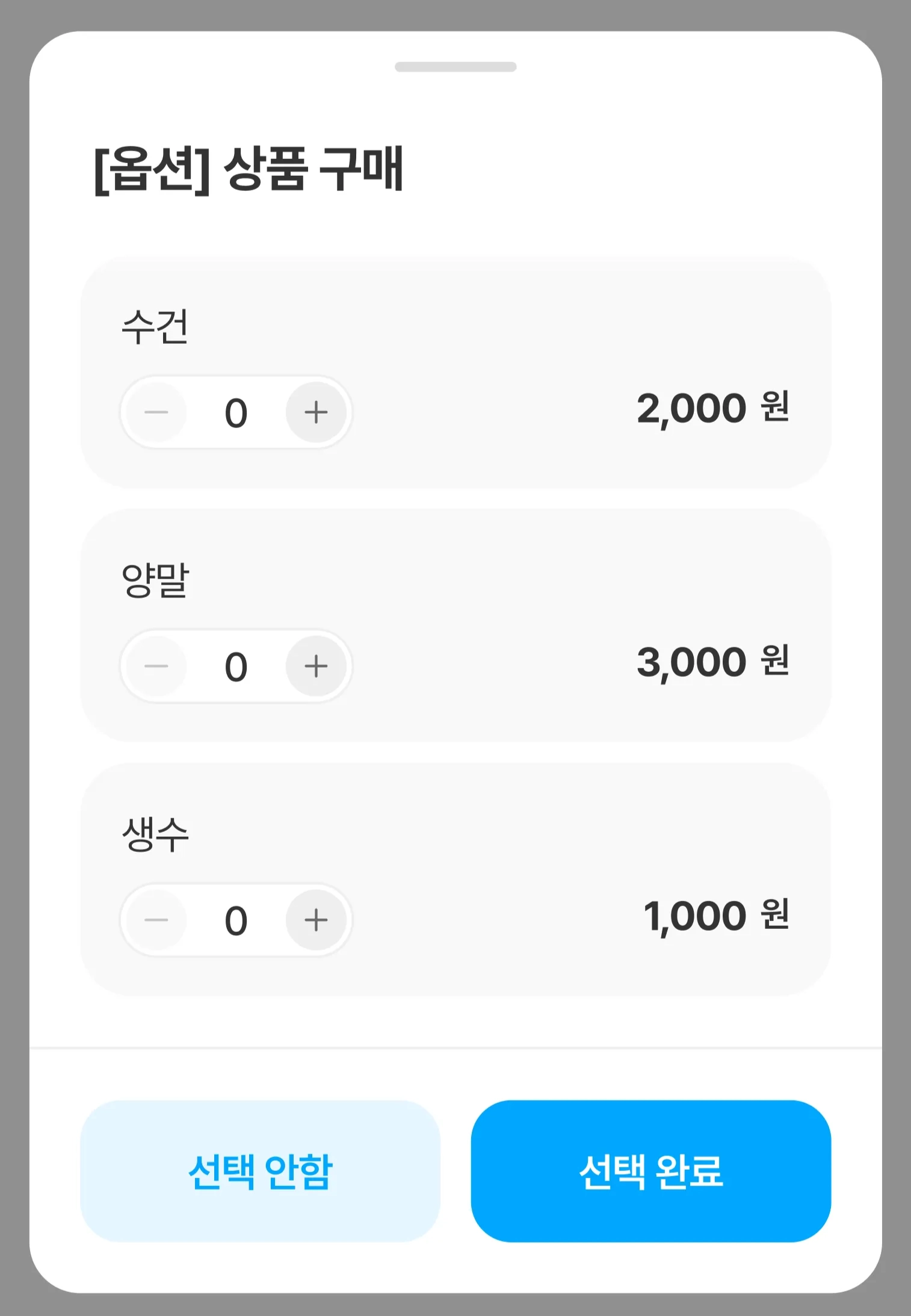 옵션은 필수 옵션과 선택 옵션으로 구분되며, 필수 옵션이 포함된 상품은 옵션 선택 후에만 장바구니 담기 또는 바로 주문이 가능합니다.