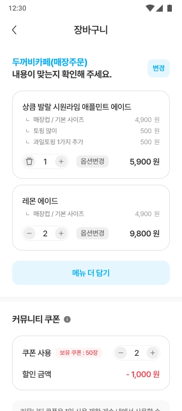 장바구니 페이지에서는 매장 정보와 담긴 상품 정보를 확인할 수 있습니다.