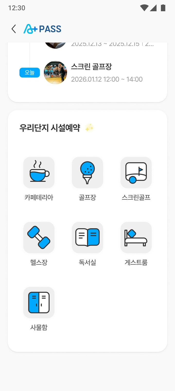 패스 홈 하단에서 단지에서 운영 중인 커뮤니티 시설의 종류를 한눈에 확인할 수 있습니다.