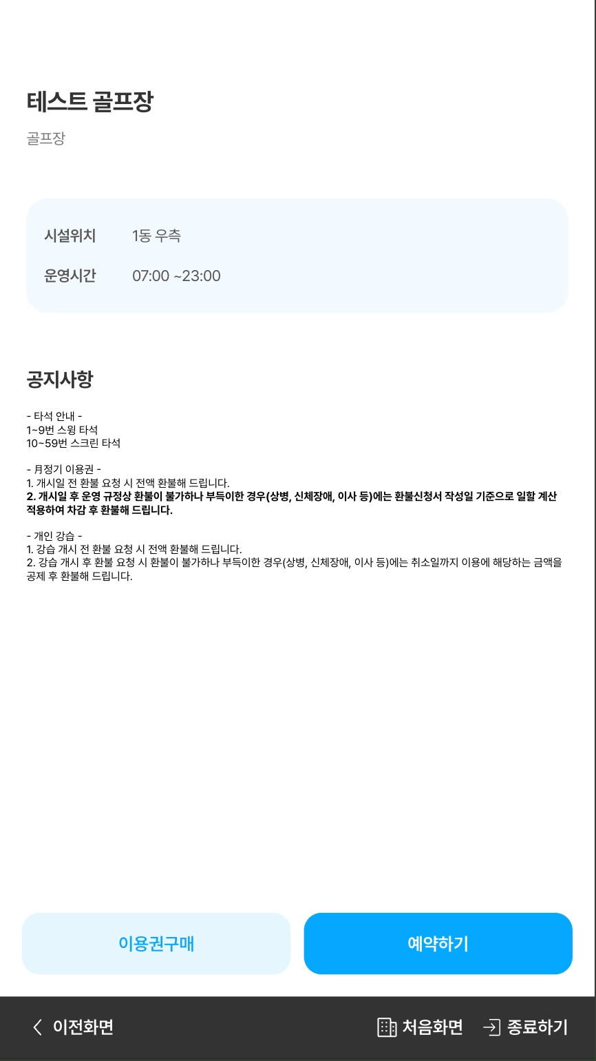 시설 정보 페이지에서 [예약하기] 버튼을 누르면 구매 가능한 이용권을 확인할 수 있습니다.