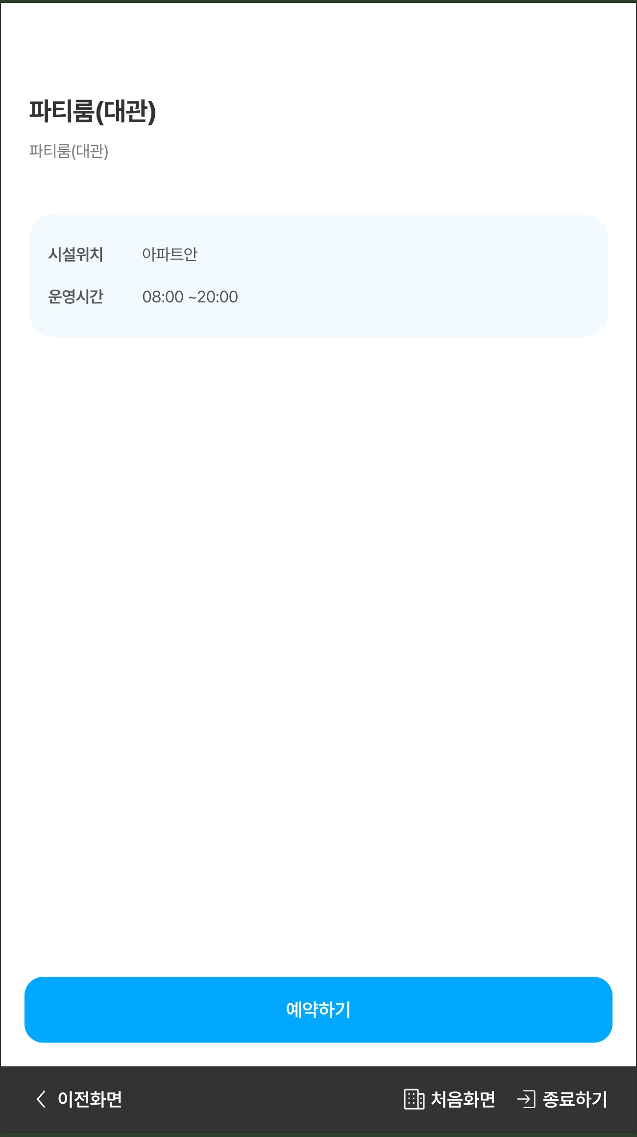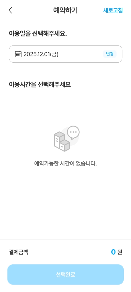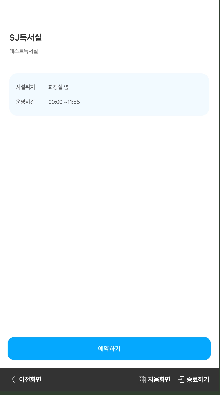 시설 정보 화면에서 [예약하기] 버튼을 눌러 예약을 할 수 있습니다.