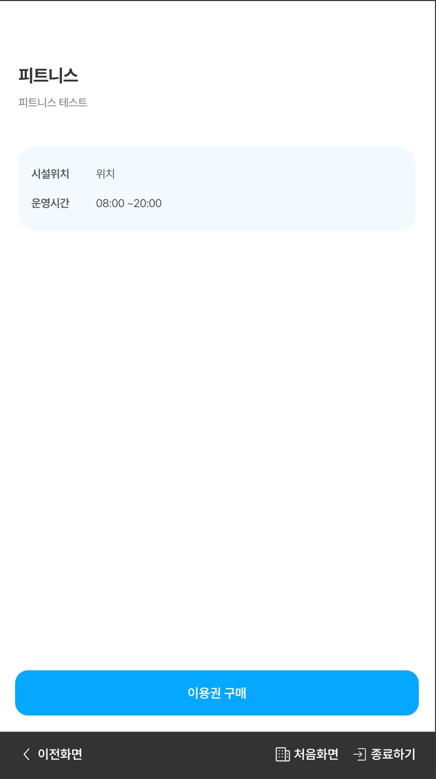 기본정보 화면에서 하단의 [이용권 구매] 버튼을 누르면 시설에서 판매하는 이용권을 구매할 수 있습니다.