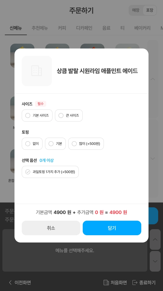 상단의 매장/포장을 탭하면 주문 방법을 변경할 수 있습니다.