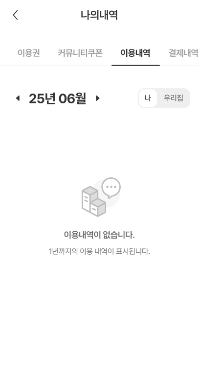 [나]를 선택하면 본인이 이용한 내역만 확인이 가능하며, [우리집]을 선택하면 세대 구성원 모두의 이용내역을 확인할 수 있습니다.