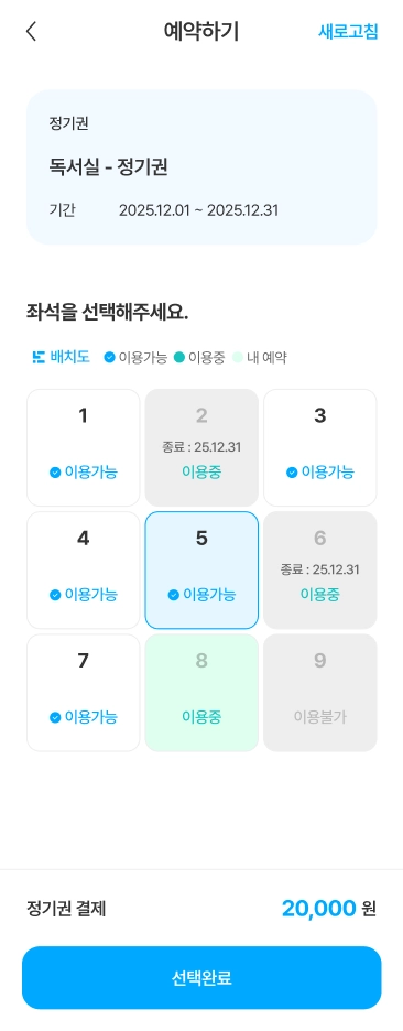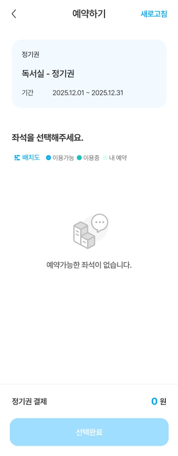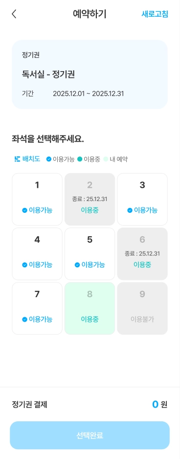 이용권을 선택하면 좌석 지정이 가능하며, 선택한 이용권의 가격이 그대로 적용됩니다. 단, 이용 가능한 좌석이 없을 경우 좌석이 표시되지 않을 수 있습니다.
