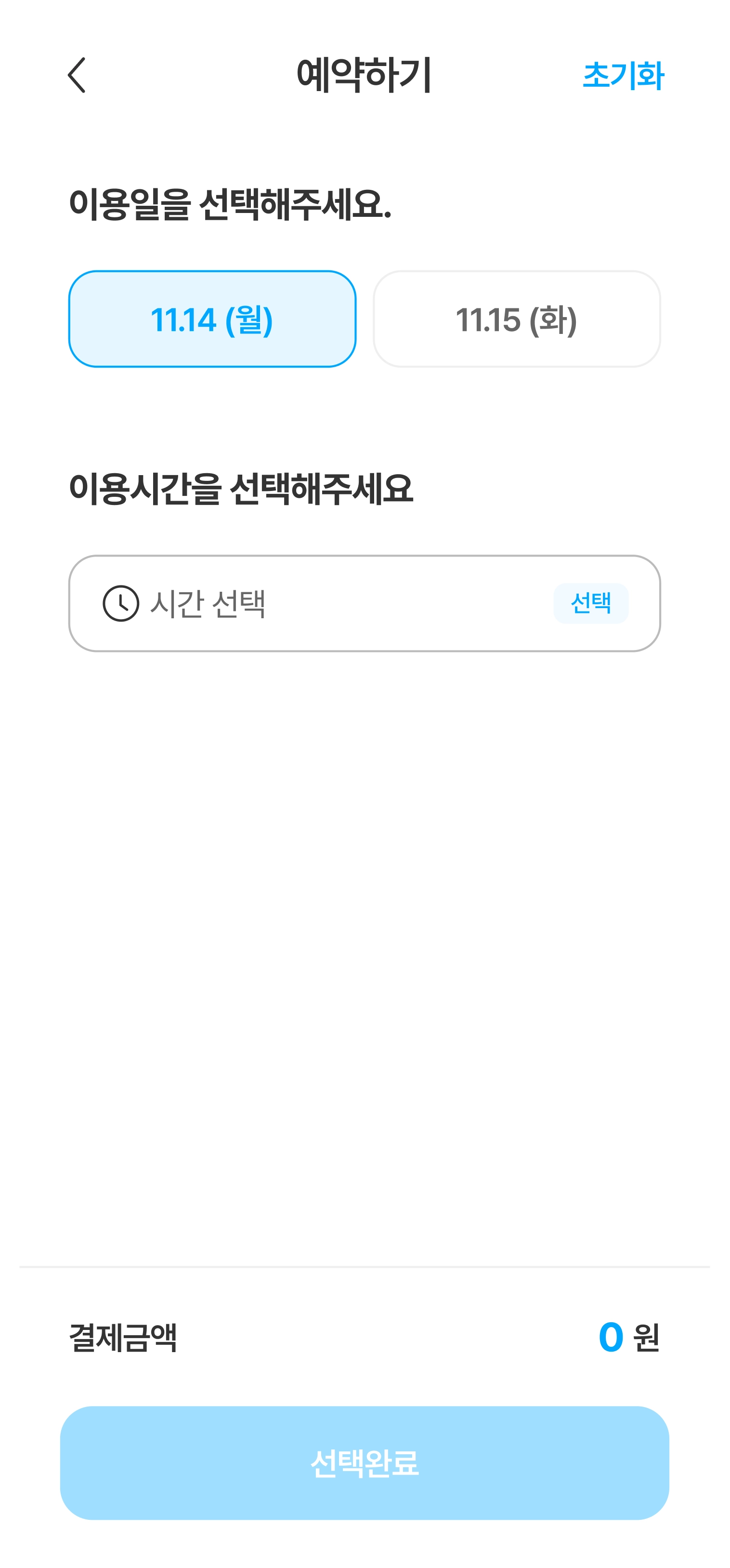 [초기화] 버튼을 누르면 선택한 일정이 모두 초기화되고, [선택완료] 버튼을 누르면 시설 옵션에 따라 상품을 구매할 수 있습니다.