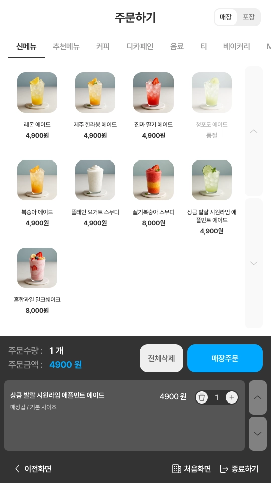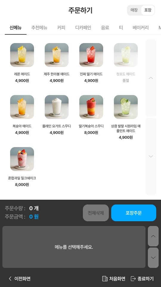 카페에서 제공하는 상품 카테고리를 선택하면, 해당 카테고리의 상품 목록이 표시됩니다.