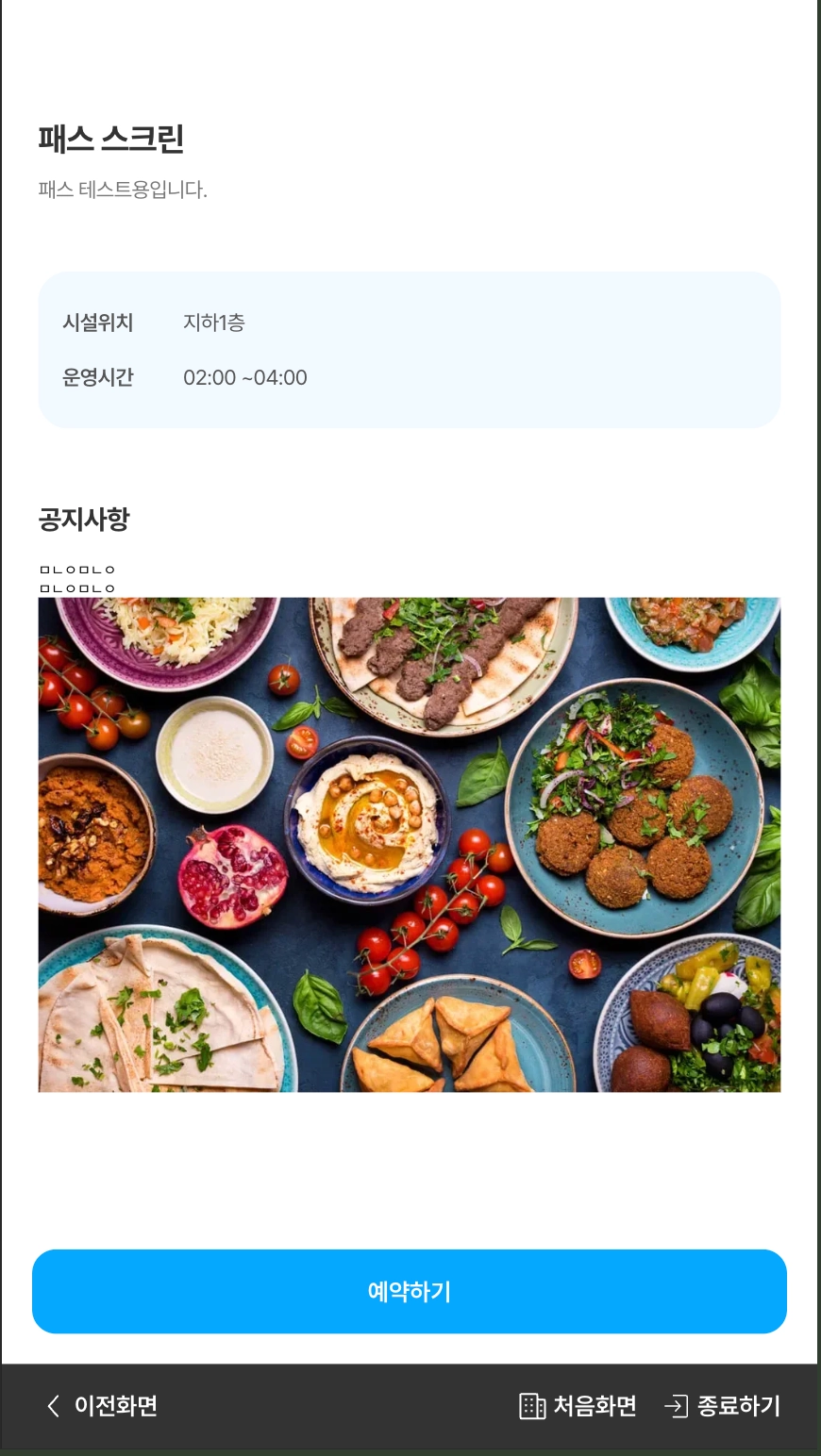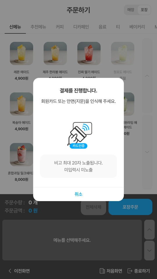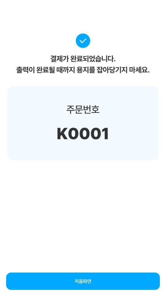 [처음화면] 버튼을 클릭할 경우 키오스크 초기화면으로 이동합니다.