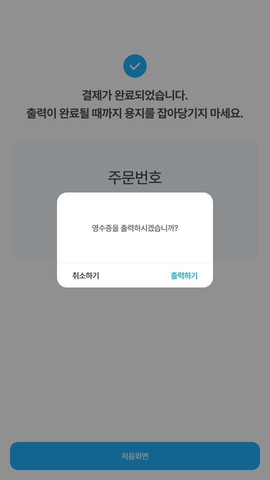 주문 완료 페이지에서 영수증 출력 여부를 확인하며 출력을 희망할 경우 영수증과 교환권 모두 출력되고, 출력을 거절할 경우 교환권만 출력됩니다.