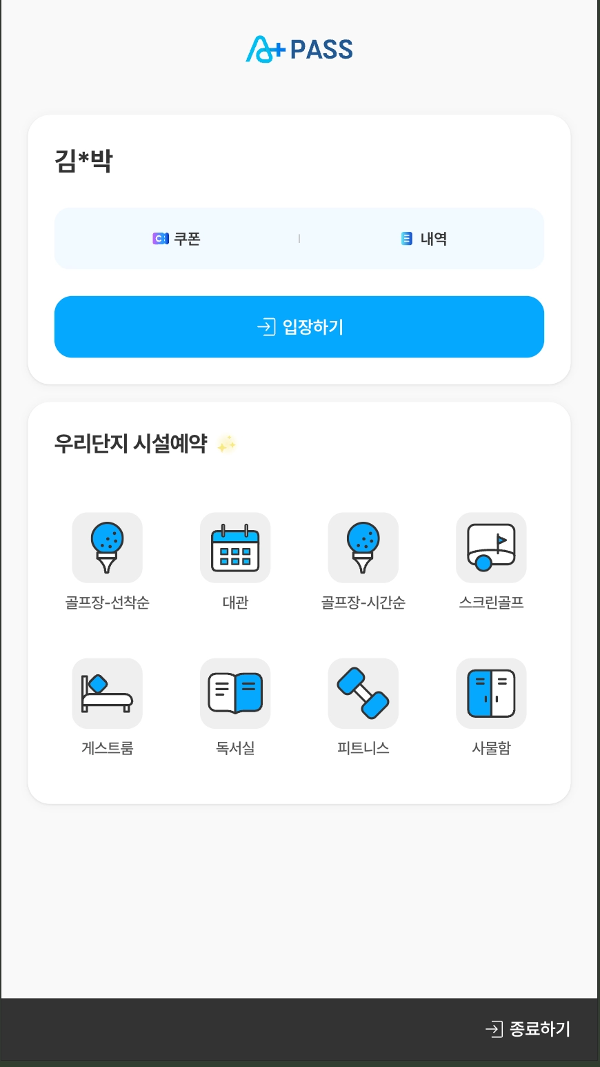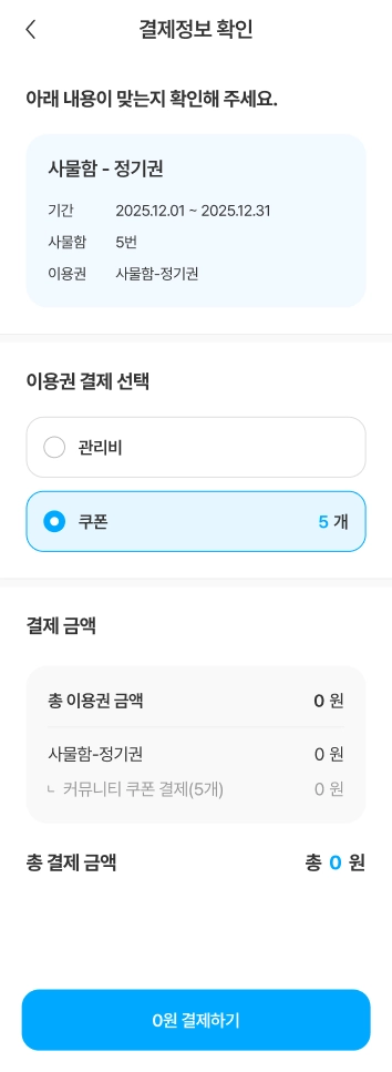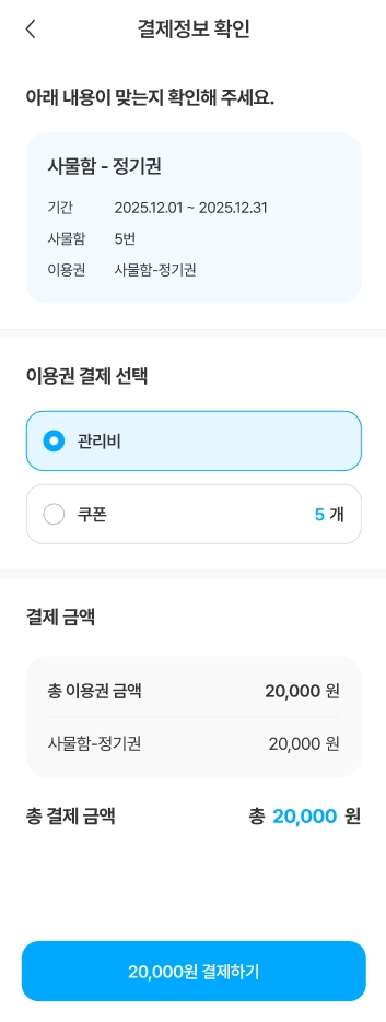 시설 운영 방식에 따라 이용권은 관리비나 커뮤니티 쿠폰으로 결제할 수 있습니다.