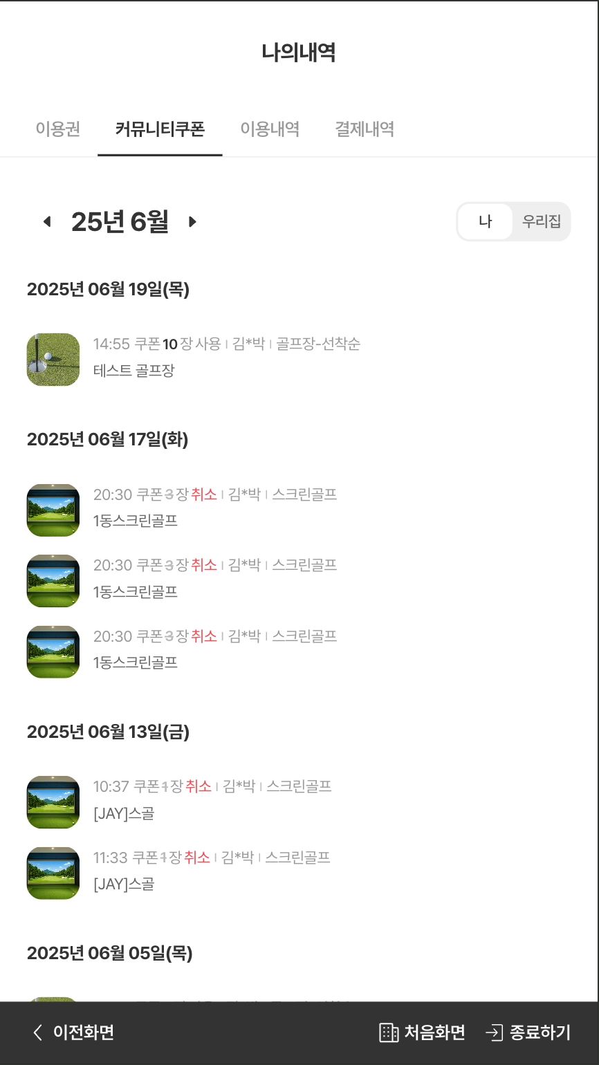 커뮤니티 쿠폰 사용 내역이 월별로 정리되며, 각 내역은 일자 기준으로 분류되어 표시됩니다.