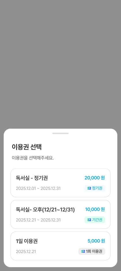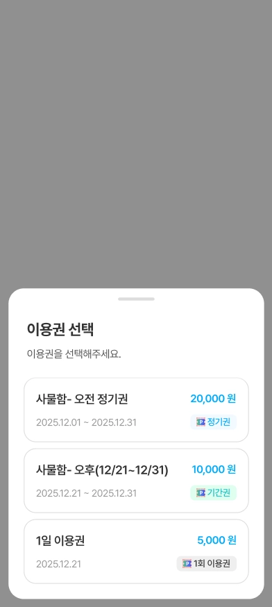 시설 정보 페이지에서 [이용권 구매] 버튼을 누르면 구매 가능한 이용권을 확인할 수 있습니다.