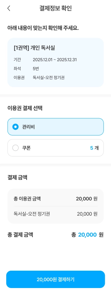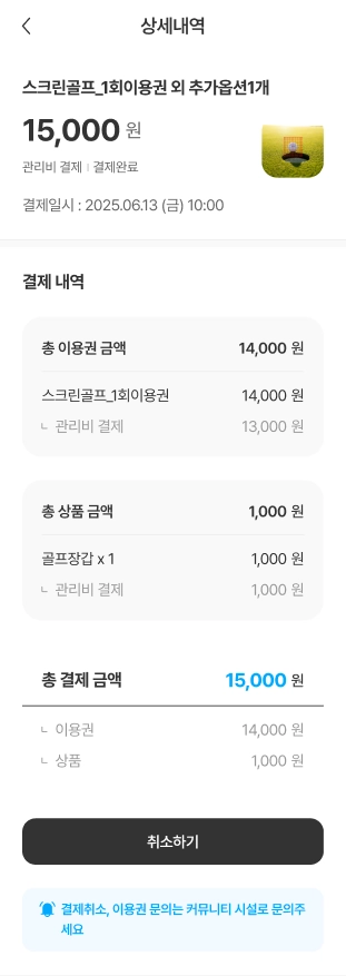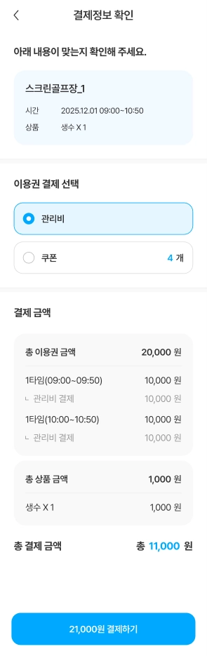 결제는 시설 및 해당 시설의 이용권 운영 정책에 따라 관리비 또는 커뮤니티 쿠폰으로 결제가 가능합니다.