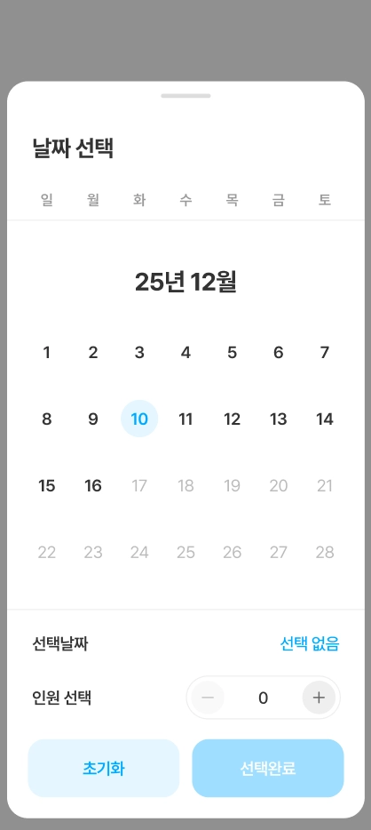 시설 정보 페이지에서 [예약하기] 버튼을 누르면 숙박하고자 하는 날짜를 선택할 수 있습니다.