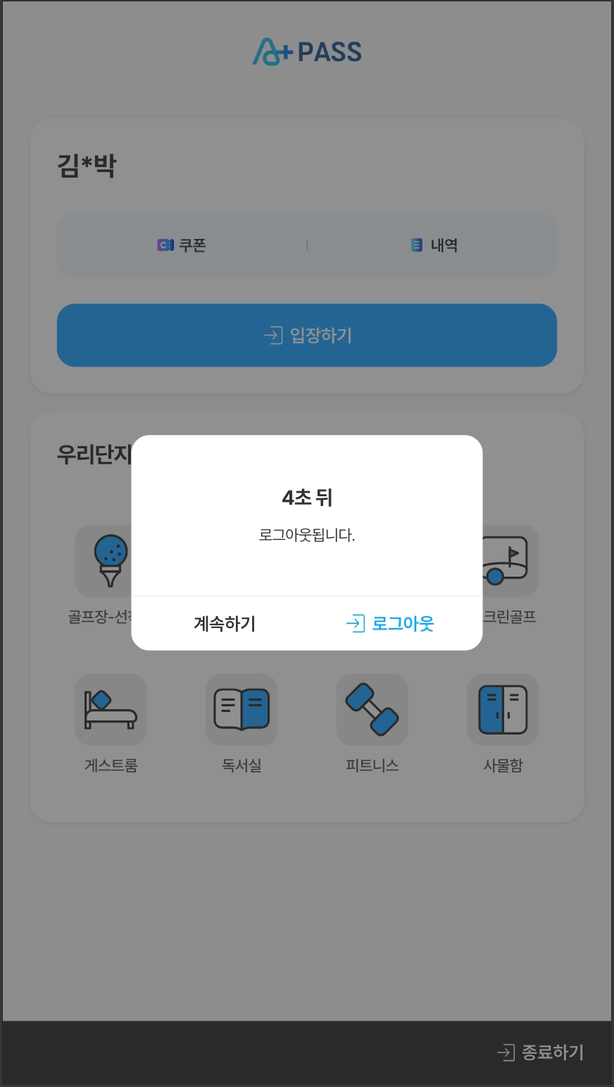입주민 인증 후 일정 시간 동안 조작이 없을 경우 자동 로그아웃되도록 설정할 수 있습니다.