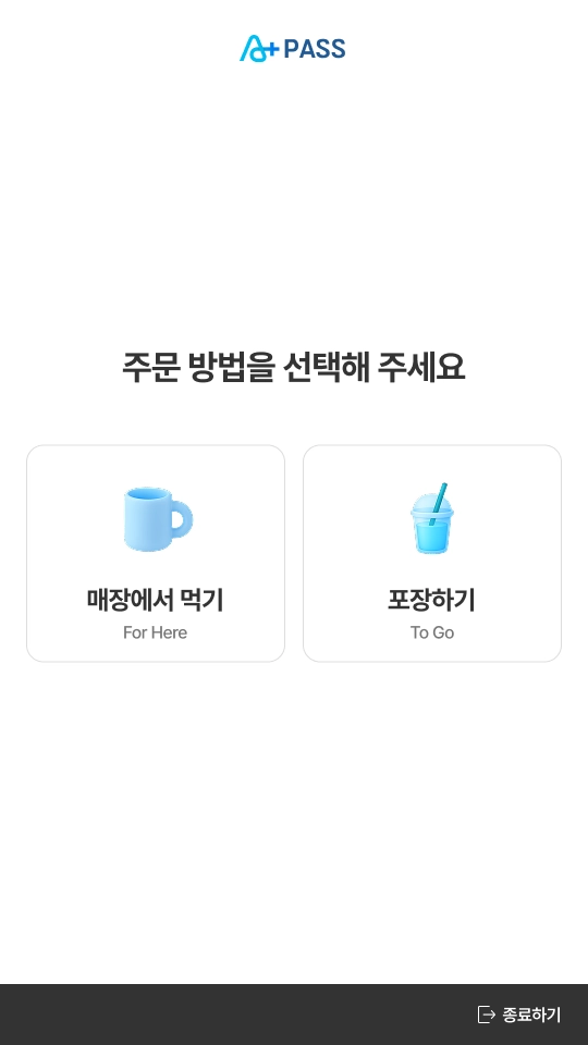 주문 방법은 [매장에서 먹기]와 [포장하기] 중 하나를 선택할 수 있습니다.