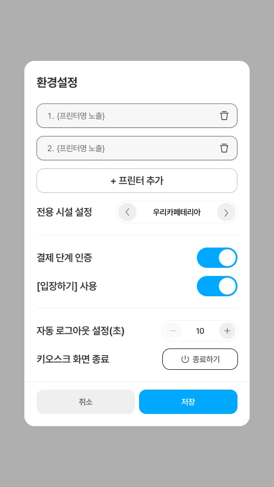 기본적으로 키오스크는 공용 시설로 설정되어 있으며, 환경설정에서 카페를 전용 시설로 지정하면 카페 주문 전용으로 사용할 수 있습니다.