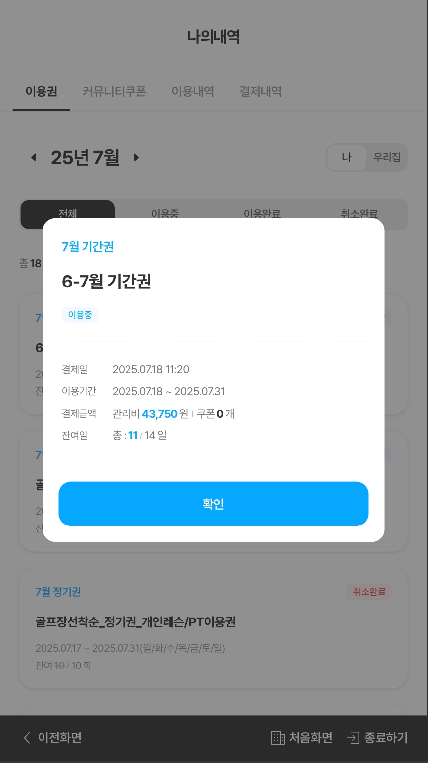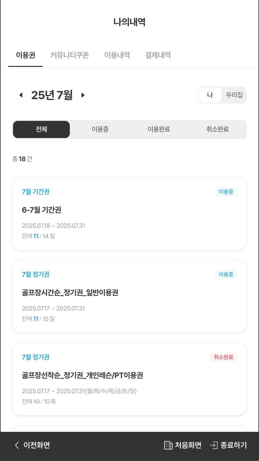 이용권은 월 단위로 표시되며, 이용권의 이용가능 상태 ‘이용중’, ‘이용완료’, ‘취소완료’를 기준으로 분류하여 확인할 수 있습니다.