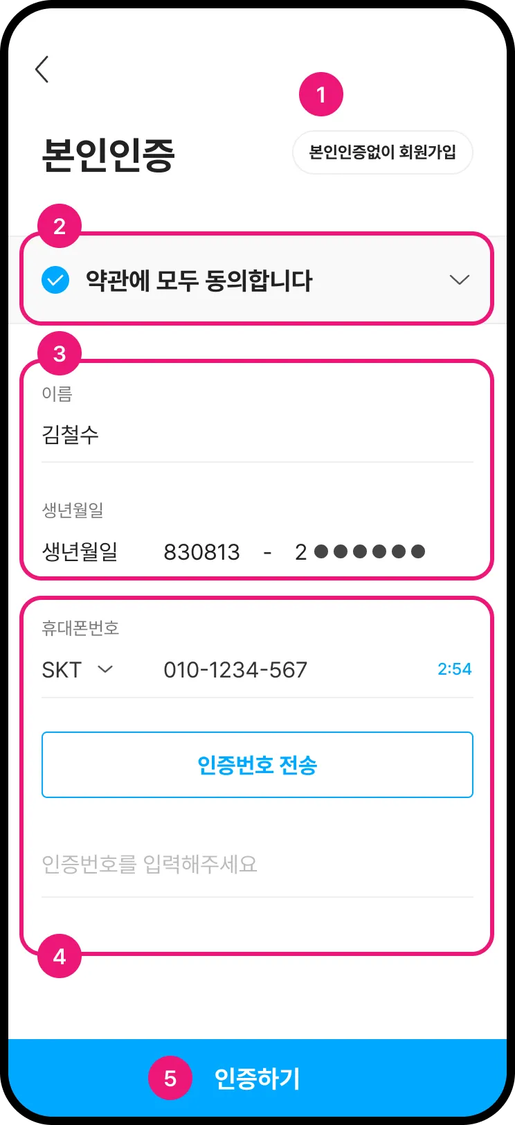 휴대폰 본인인증을 통해 회원가입을 할 수 있습니다.