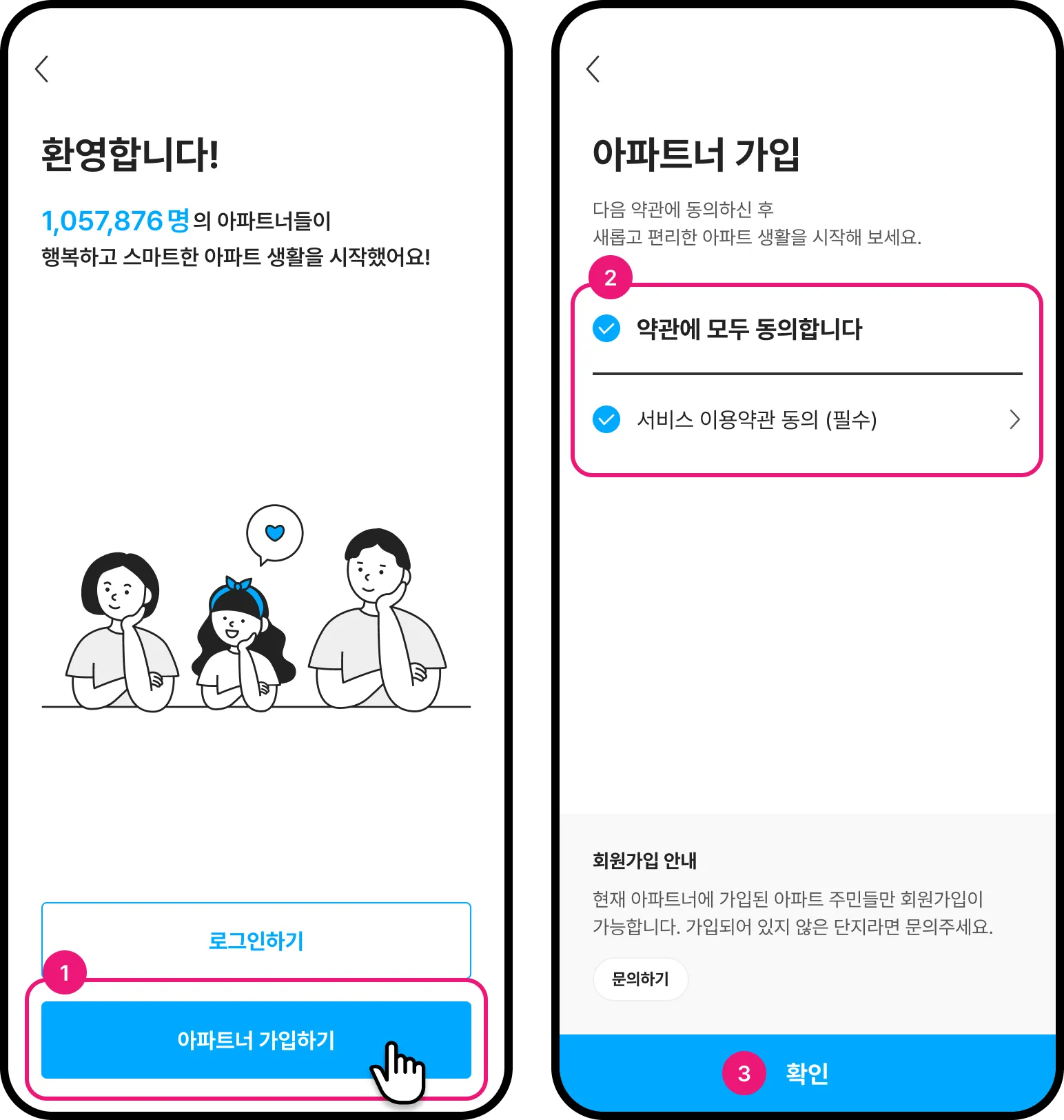 아파트너를 처음 사용하는 입주민은 로그인 페이지 하단 [회원가입] 버튼을 눌러 주세요.
