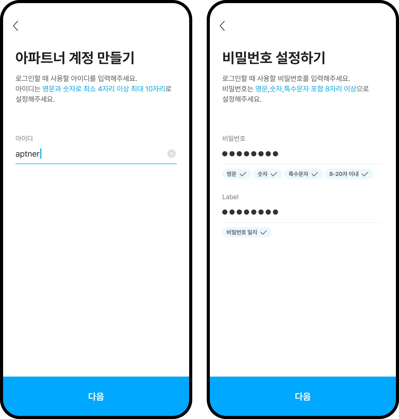 인증이 완료되면 아파트너 계정 만들기 페이지로 이동합니다.