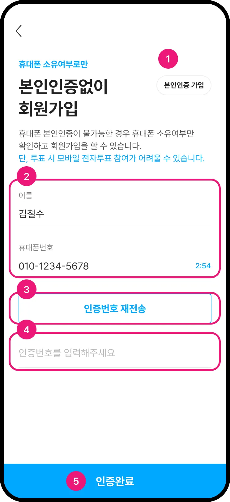 휴대폰 본인인증이 불가능한 경우, 본인인증없이 휴대폰 소유여부로 회원가입을 할 수 있습니다.