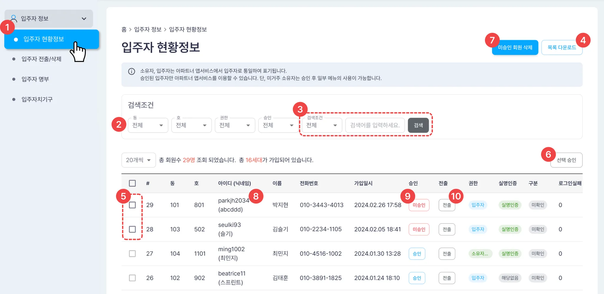10. 3. 1. 입주자 현황정보로 삭제(승인 or 미승인 입주민)