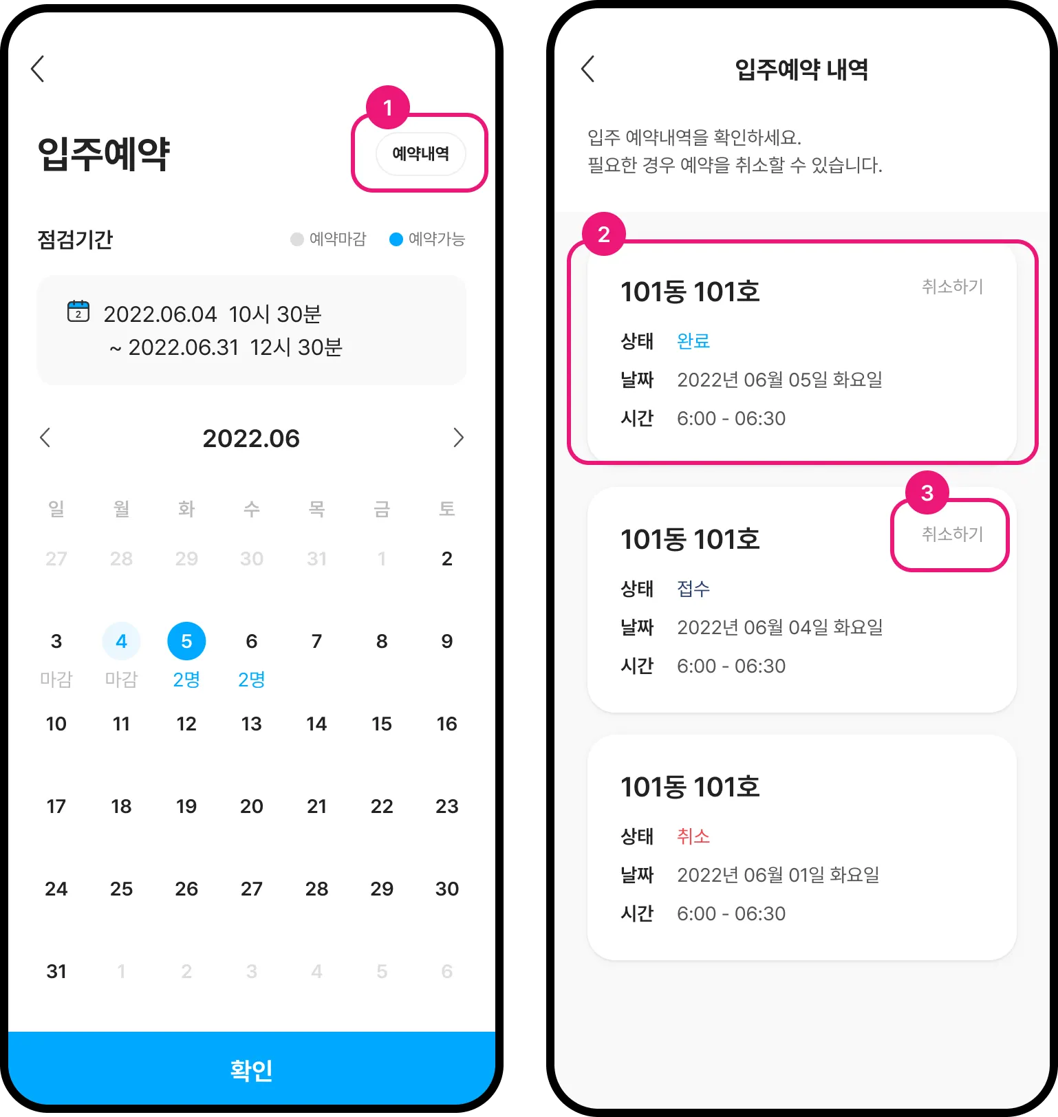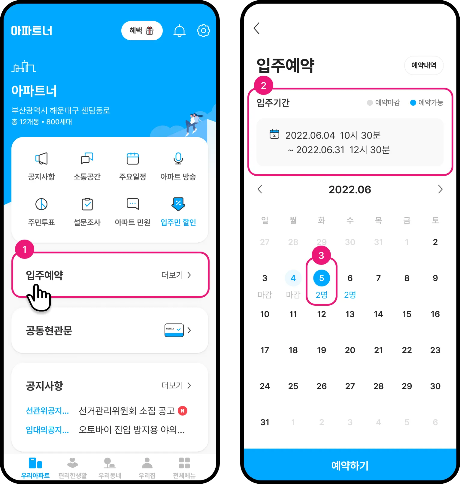 내 아파트 동호수와 선택한 날짜를 확인합니다.