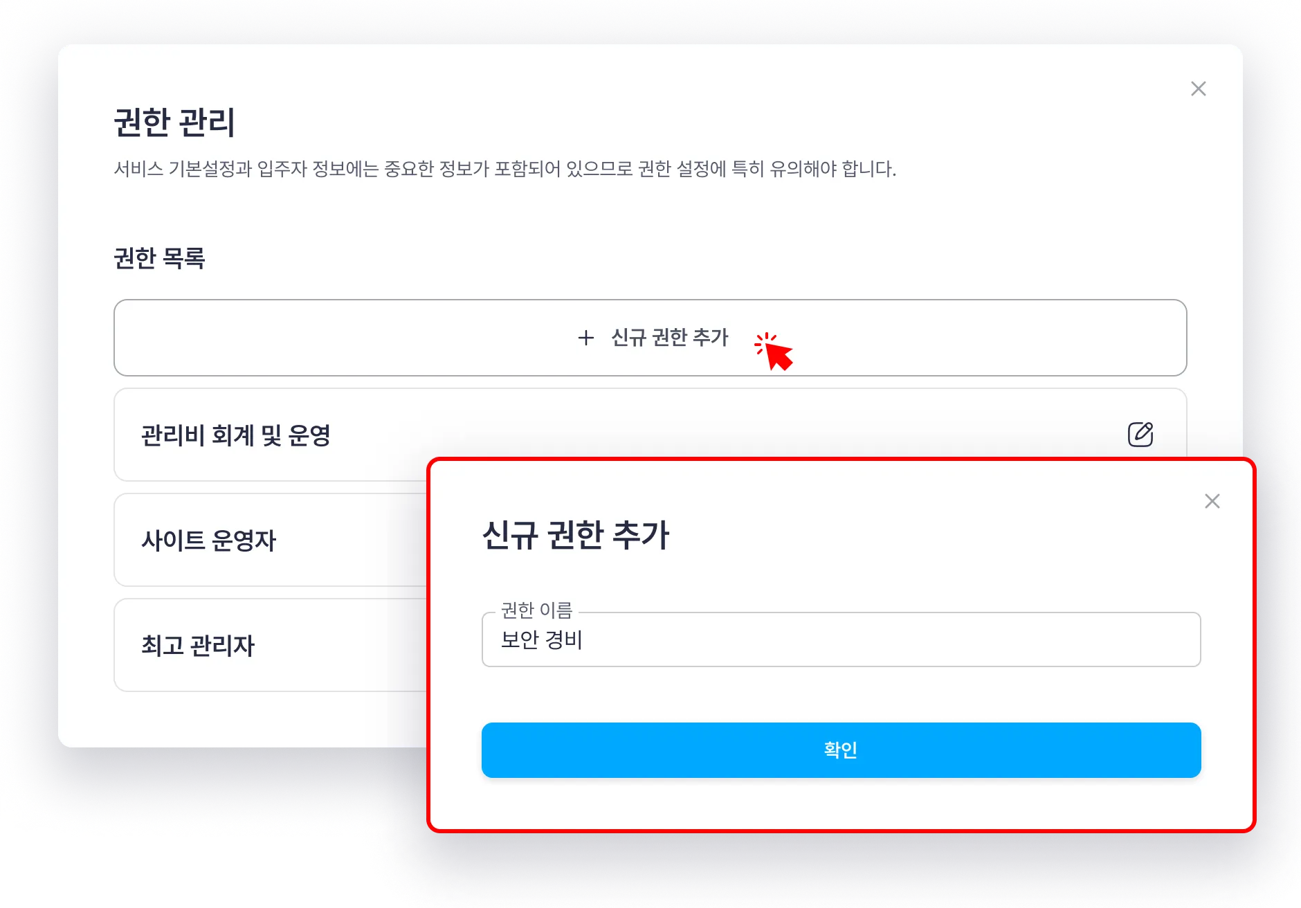 권한 관리 - 권한을 추가하거나 수정할 수 있습니다.