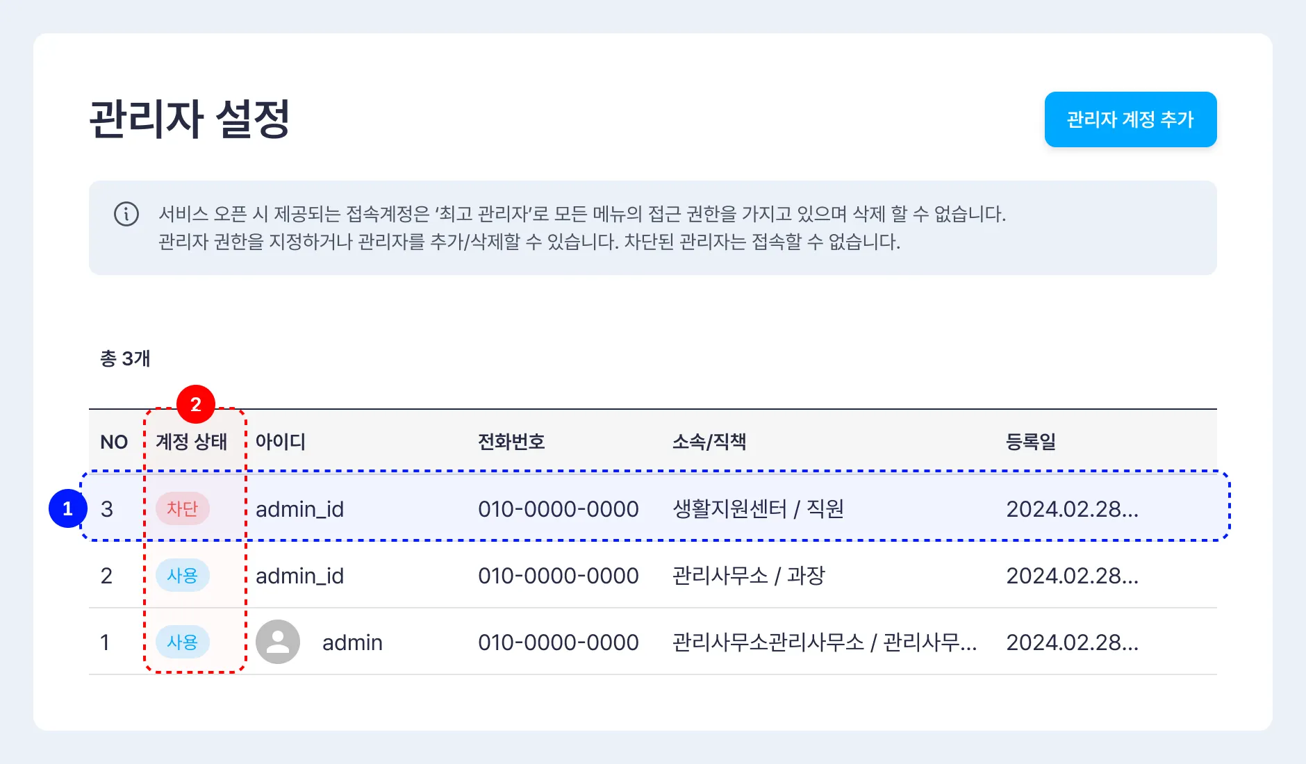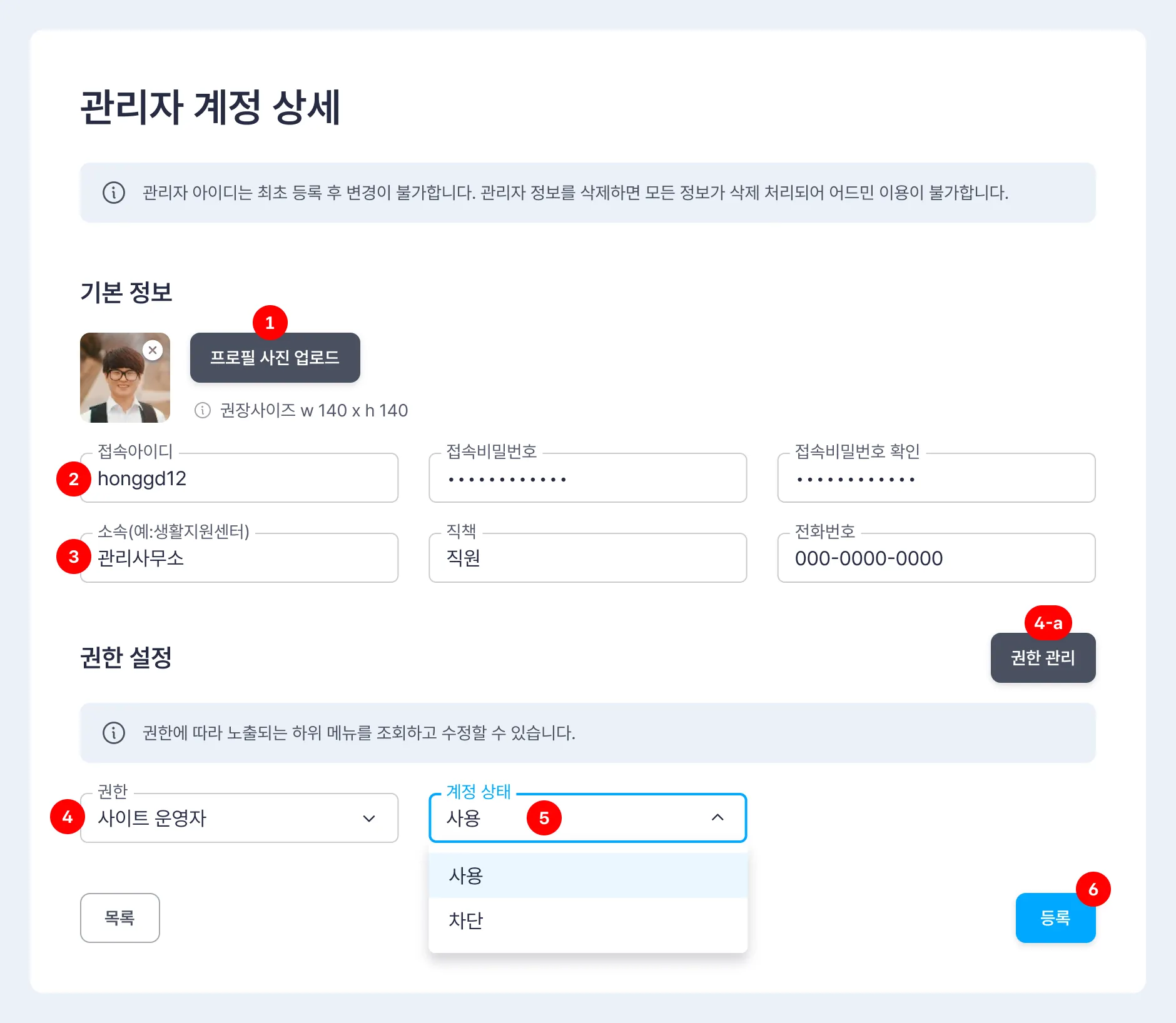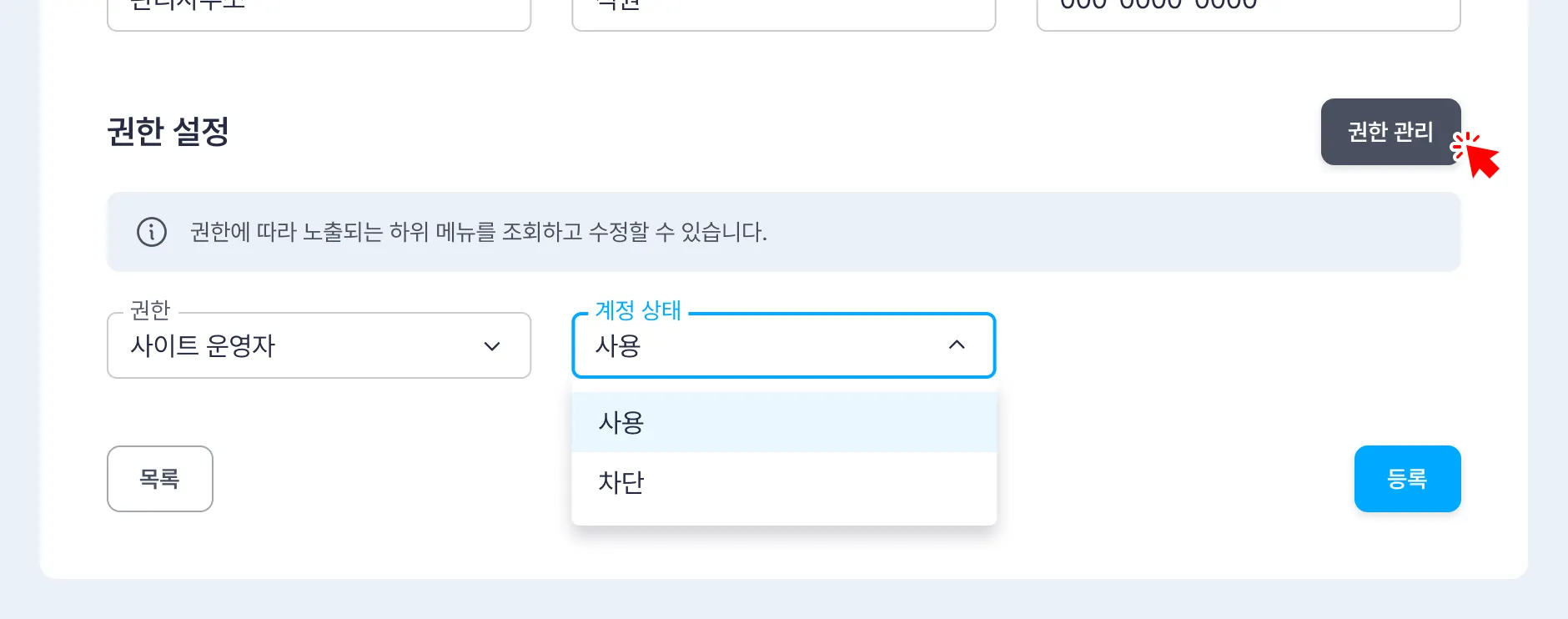 [사용] 상태의 관리자는 설정된 권한을 행사할 수 있습니다.