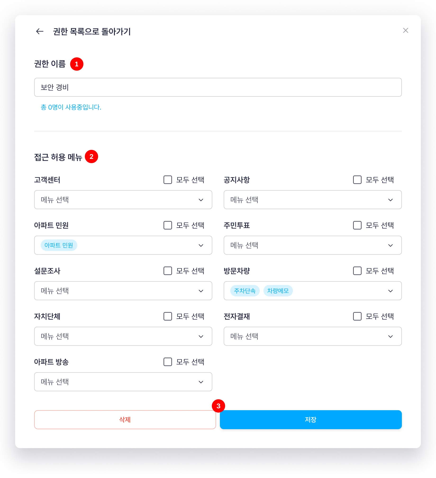 접근 허용 메뉴 : 해당 권한이 접근할 수 있는 메뉴를 선택합니다.