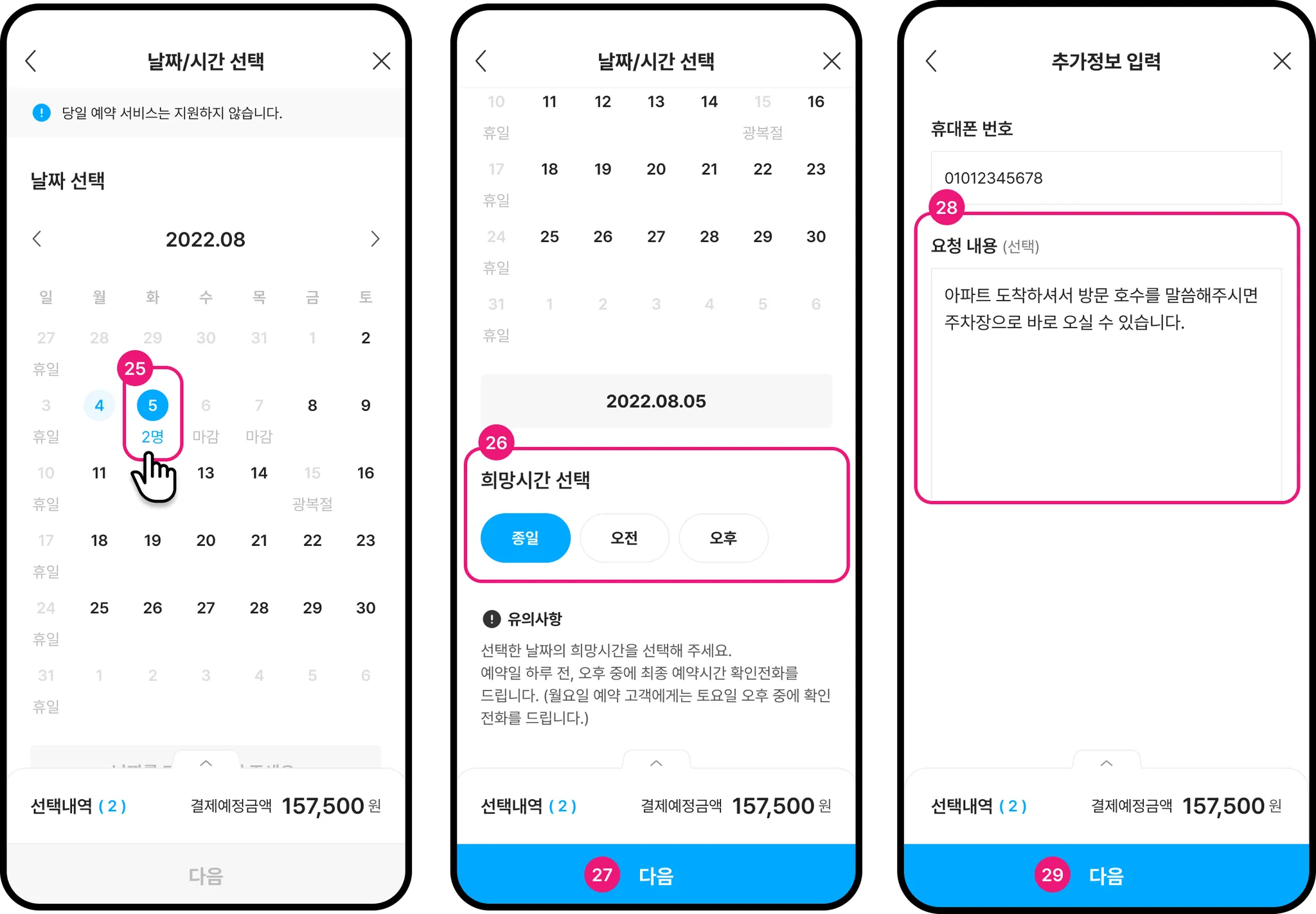 예약 마감된 날과 공휴일과 일요일은 선택할 수 없습니다.