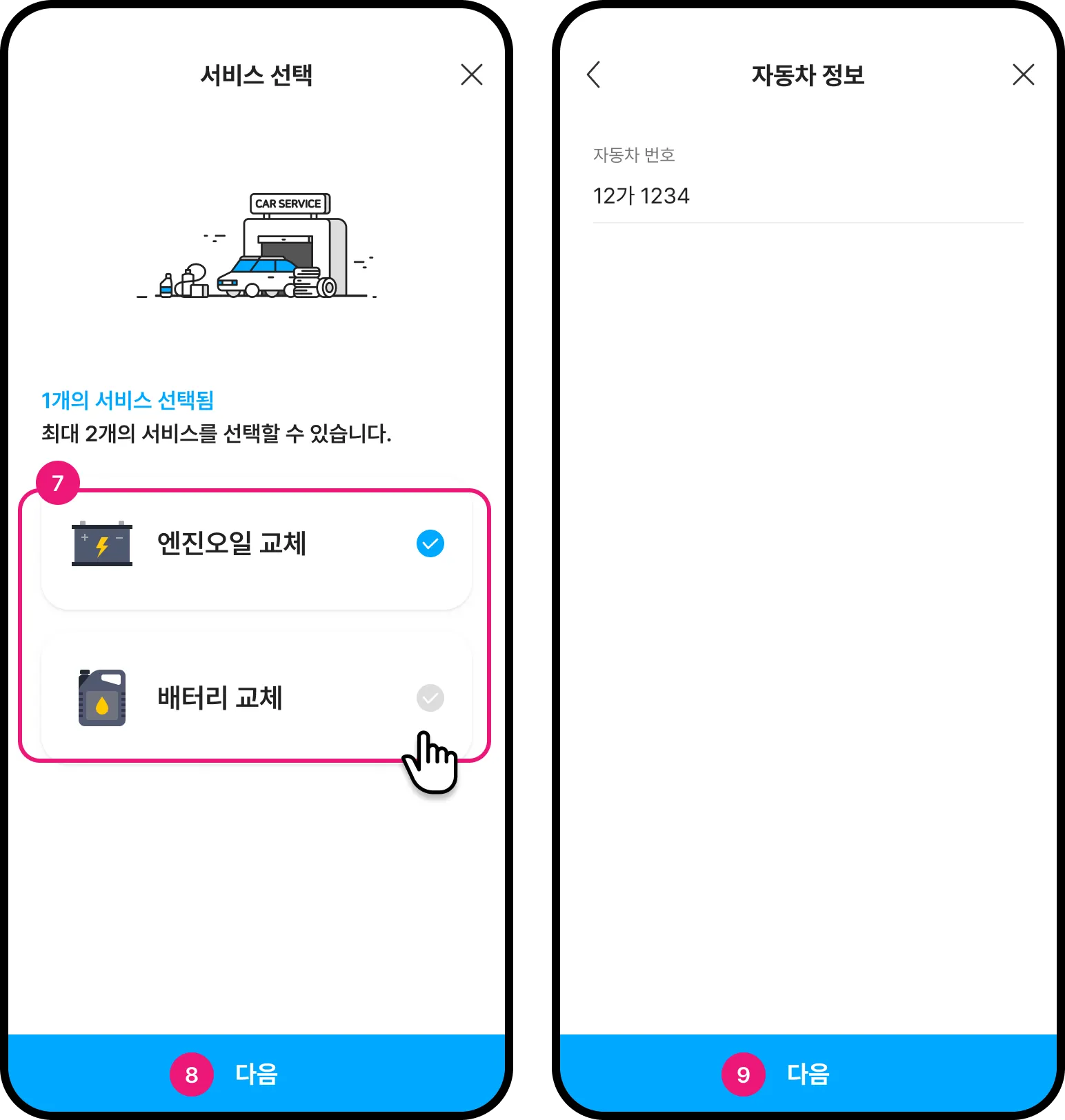 다른 차량으로 이용하고 싶다면 차량번호를 다시 입력한 후 [다음] 버튼을 누릅니다.