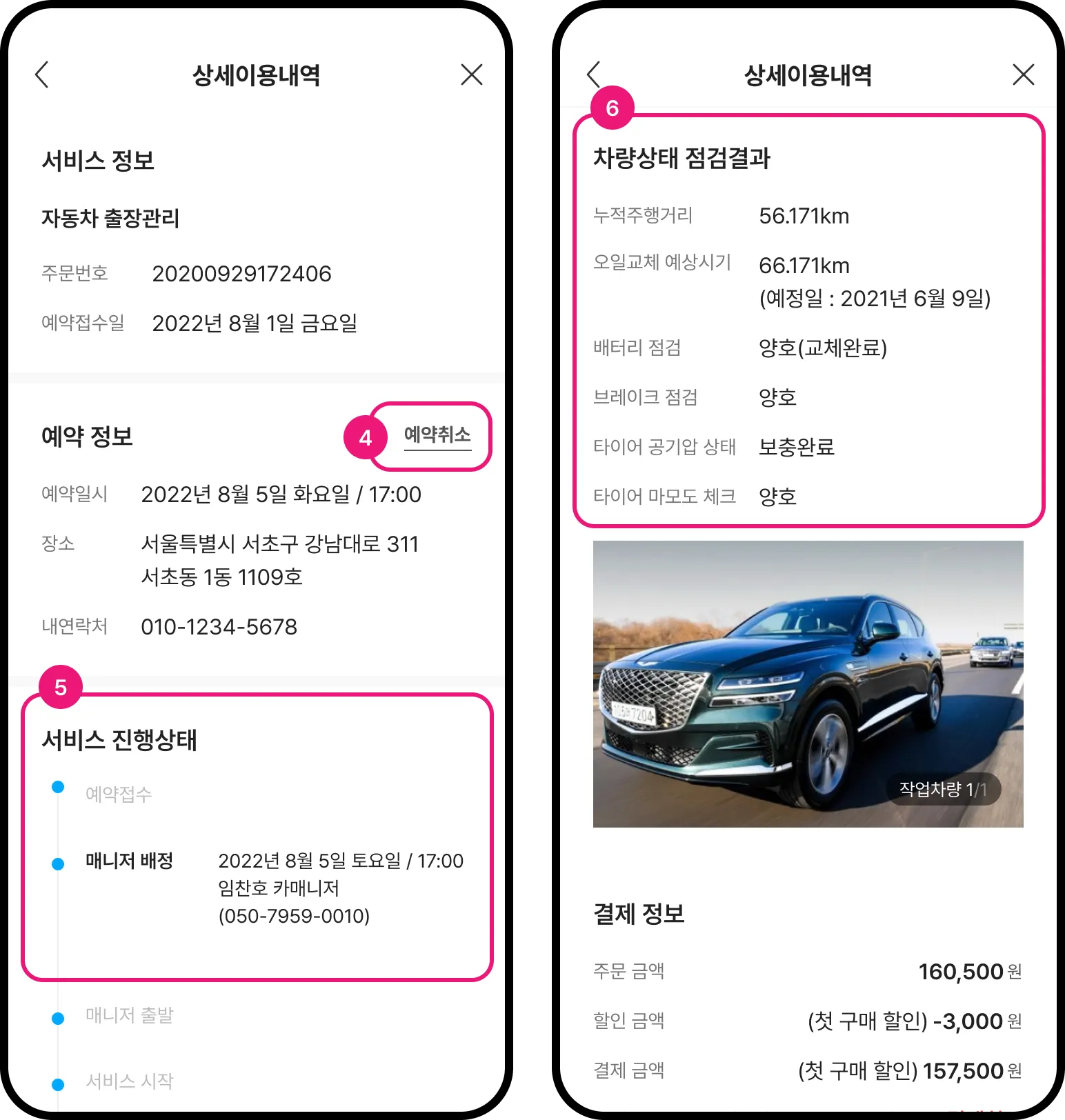 [서비스 완료]후 상세이용내역 페이지 하단에서 점검결과를 확인할 수 있습니다.