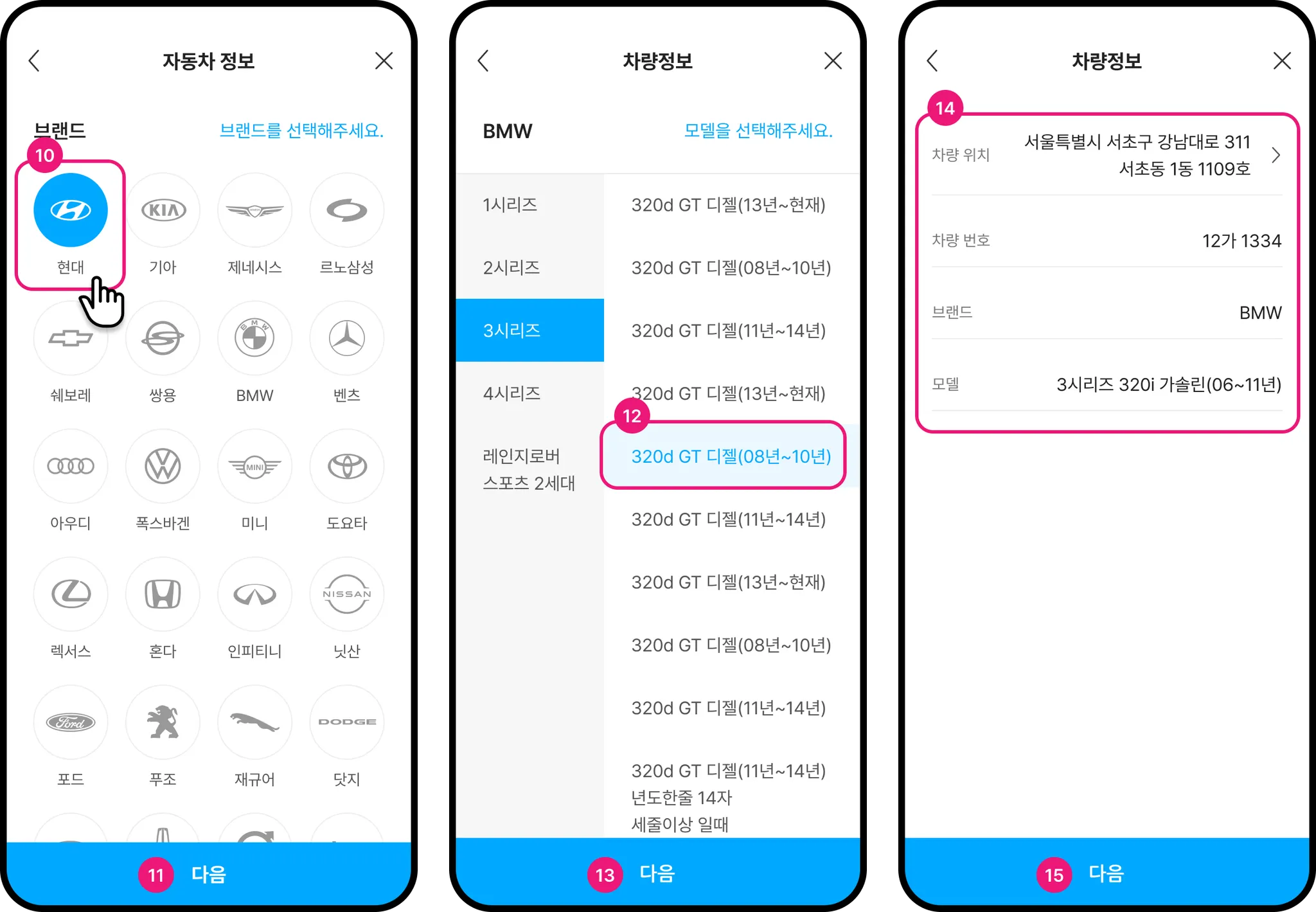 차량번호가 조회되지 않는 경우에는 먼저 차량 브랜드를 선택합니다.