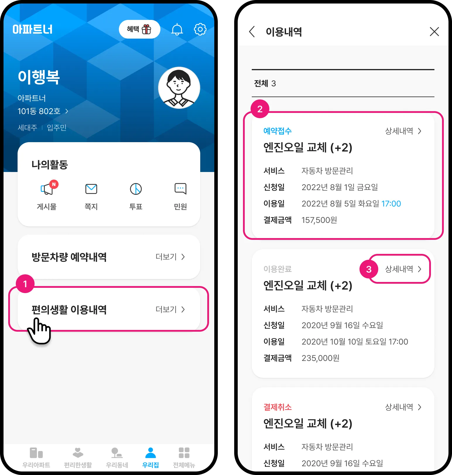 우리집 > [편의생활 이용내역]을 눌러 서비스 이용내역을 확인합니다.