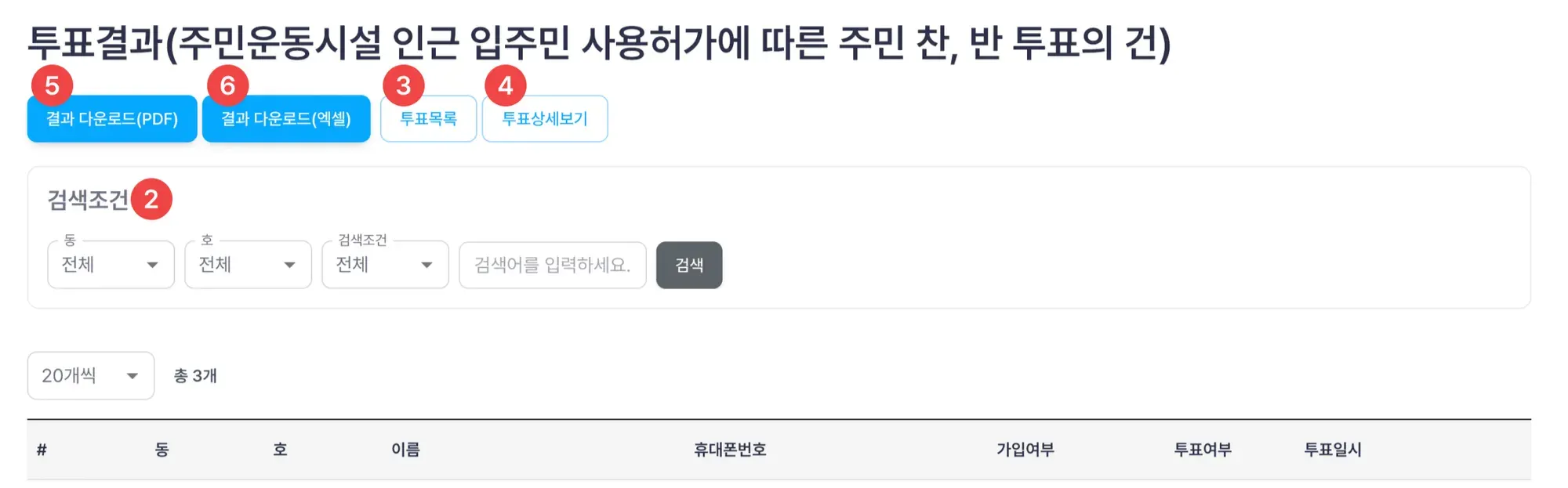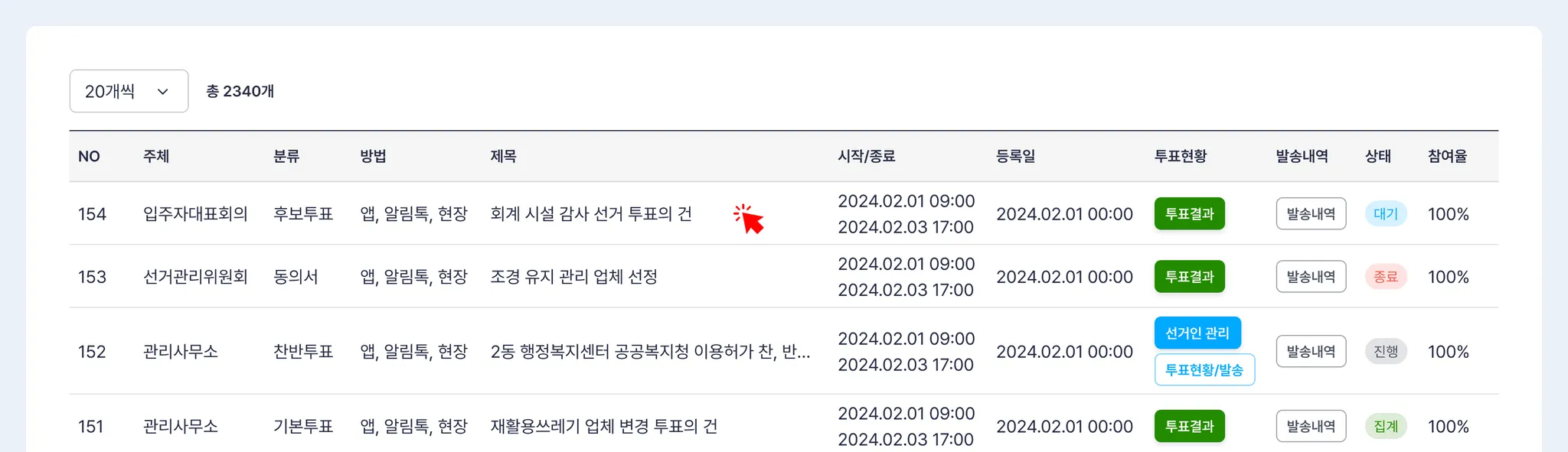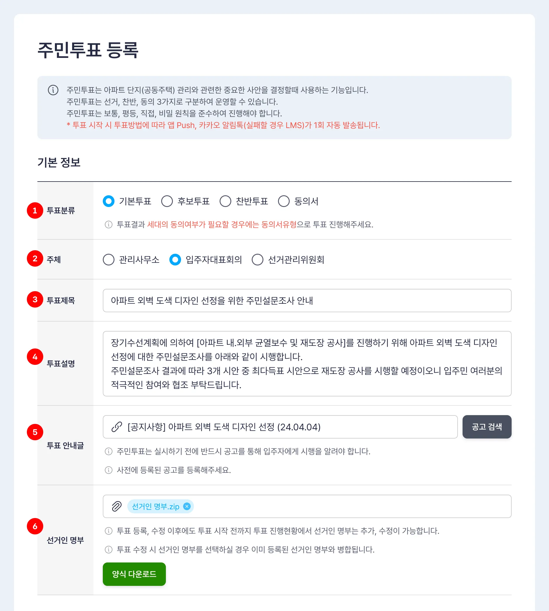 주체 : 관리사무소, 입주자대표의회, 선거관리위원회 중 투표 주체를 선택합니다.